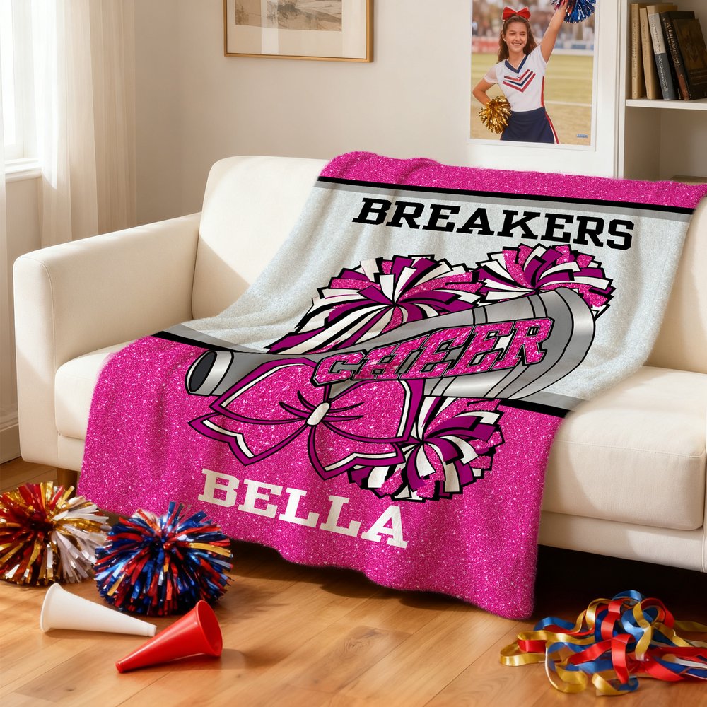 Show off your team spirit with our dazzling cheer-themed blanket featuring sparkling bling accents, vibrant pom-poms, and a cheer megaphone in energetic multicolor designs. Customize it with your name and team name to create a one-of-a-kind blanket that celebrates your squad's unique identity and brings championship energy to every use.