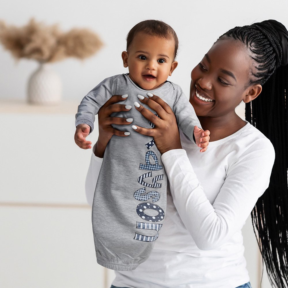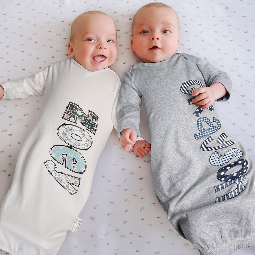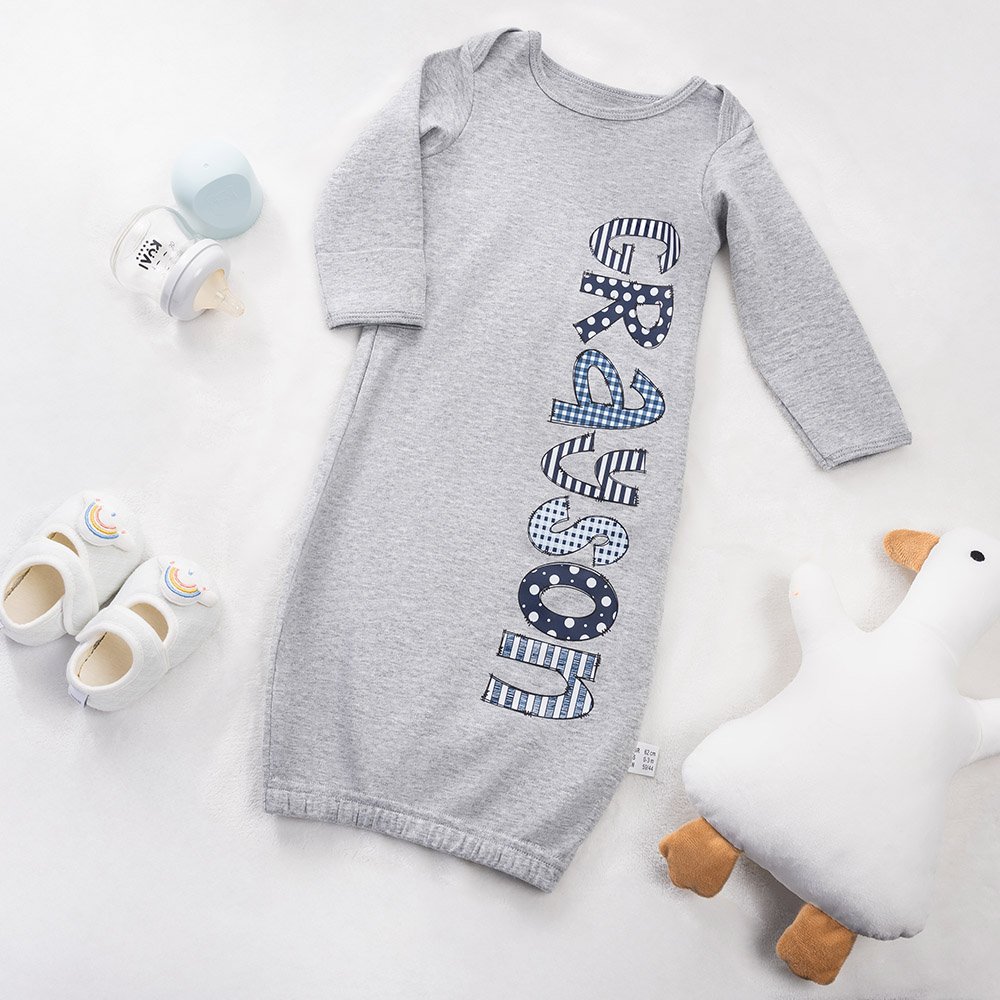 This baby gown features a colorful name design in your choice of five fonts. At the same time, there are four gown colors of white, gray, jade pink and sapphire blue for you to choose from to create unique home clothing for your baby.