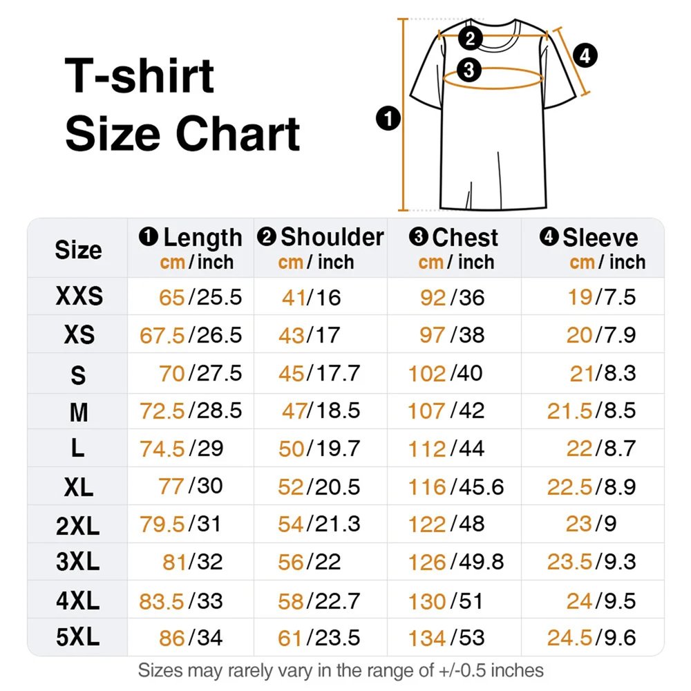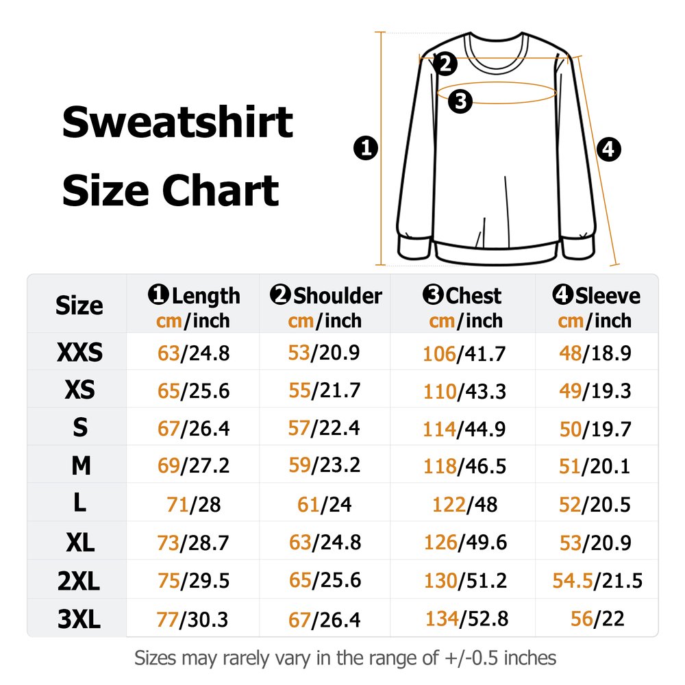 Measurement: T-shirt - XXS, XS, S, M, L, XL, 2XL, 3XL, 4XL, 5XL Sweatshirt - XXS, XS, S, M, L, XL, 2XL, 3XL