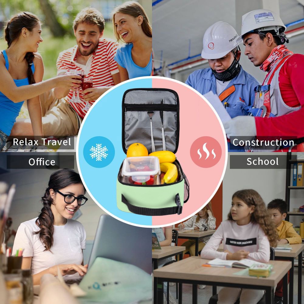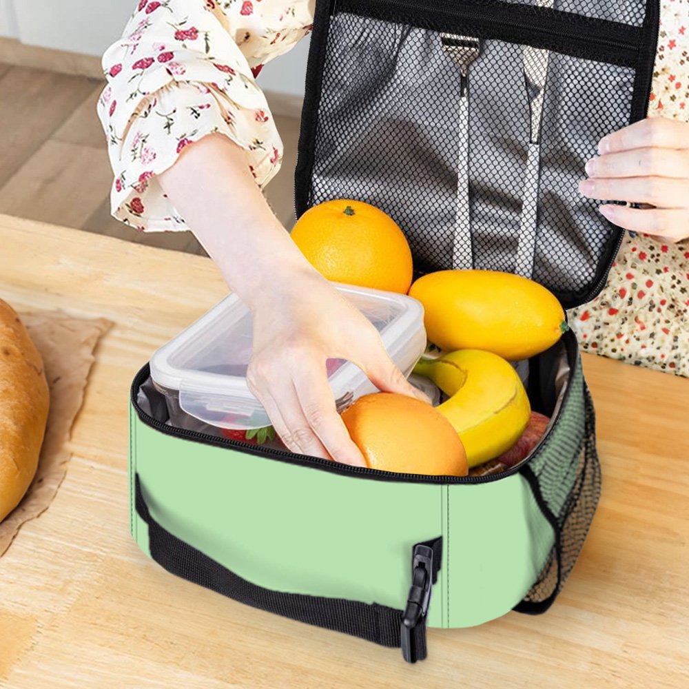The lunch bag is conveniently designed, including a main compartment with a zipper, a front zipper pocket, and a side mesh pocket for drinks. The buckle handle can be easily hung on a backpack or carry-on luggage, and the large capacity design makes it suitable for school, travel, and other needs.