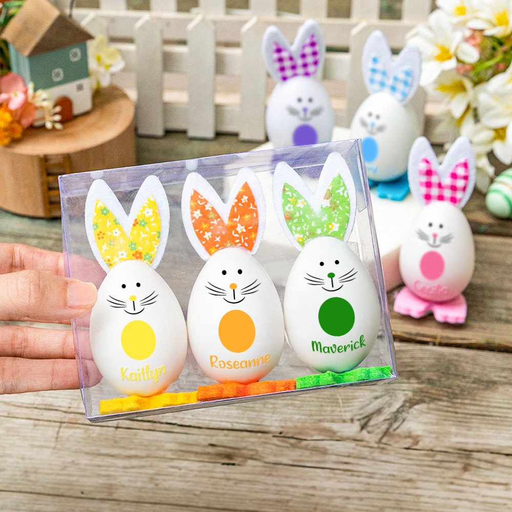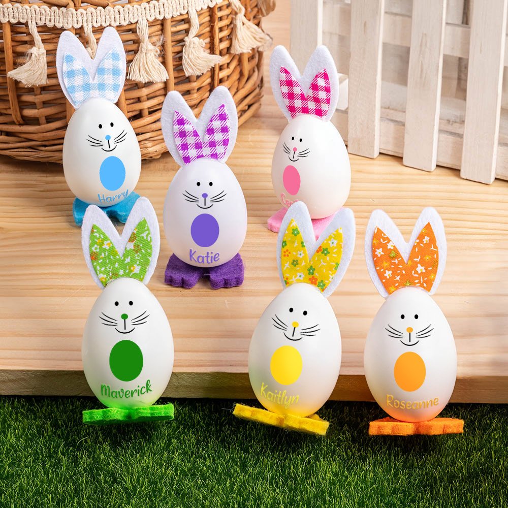 The egg bodies are sturdy, ensuring they can withstand the excitement of Easter activities. The ears and feet are securely attached, so there's no worry about them falling off easily. The printing of the names is clear and durable, maintaining its charm even after repeated handling. These decorations are built to last and be cherished by many Easters.