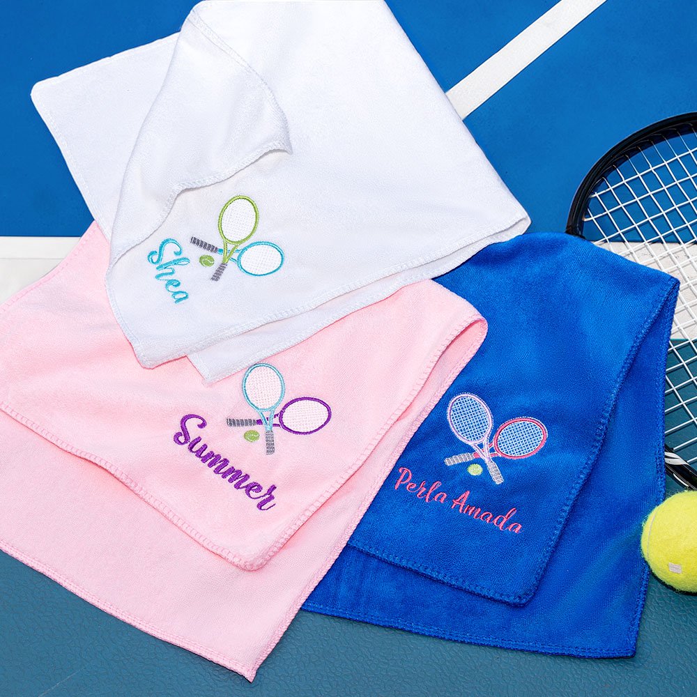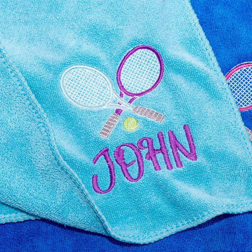 Available in various colors, this towel features a tennis racket design with intricate embroidery in multiple colors, adding a sporty and stylish element to the overall look. The standout feature of this towel is the option to personalize it with your name. Whether you want to add your name or the name of your favorite tennis player, every detail is perfectly sewn onto the towel.