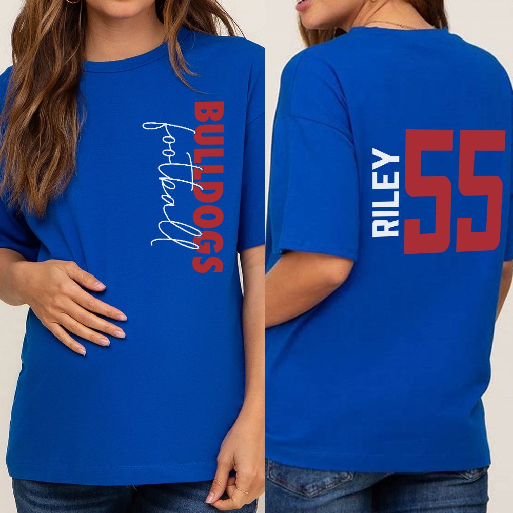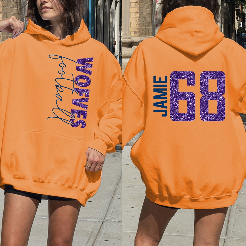 The "football" design on the clothing is invigorating, providing a way for fans to express their passion and loyalty. Available in T-shirts, crewneck sweatshirts, and hoodies, you can customize your attire's number, name, and team name. Additionally, there are various clothing colors and faux glitter text options.