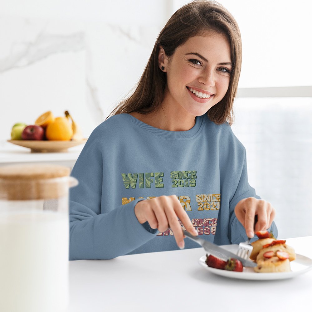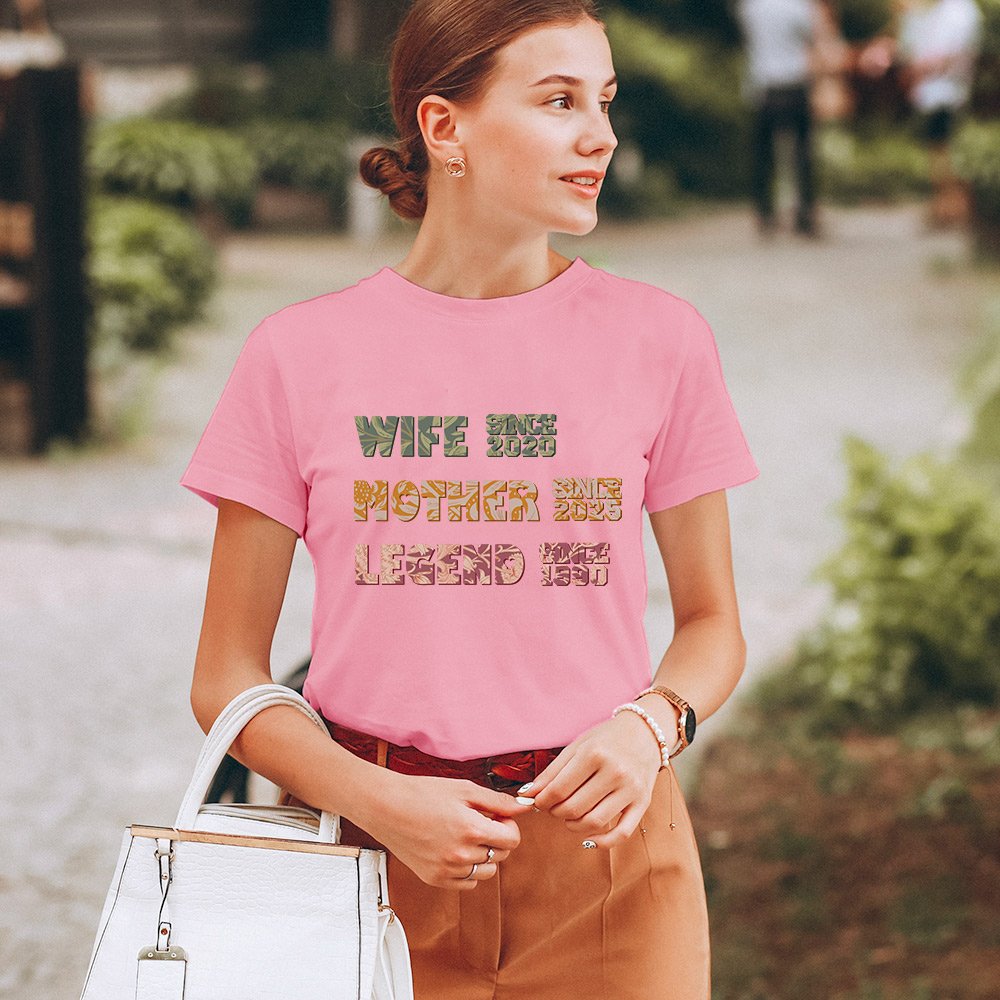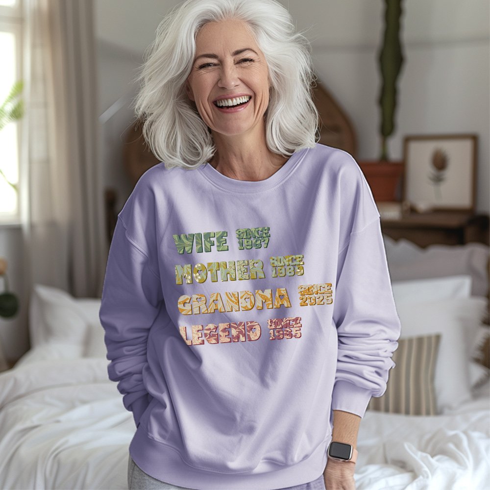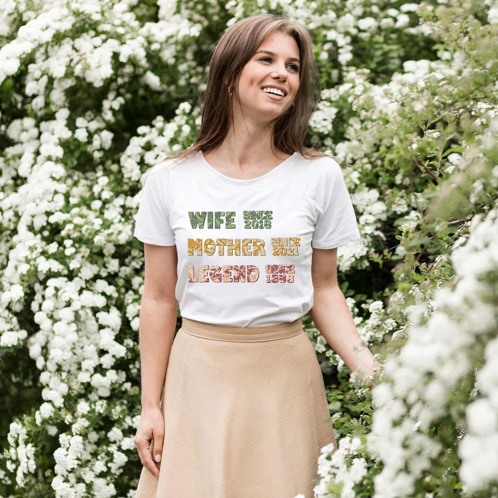 This personalized apparel uniquely honors the pivotal roles of women in your life. The words and numbers on the clothes are all in floral patterns. With customizable years marking significant milestones—like birth, marriage, and motherhood—this piece serves as a lasting tribute to their contributions.
