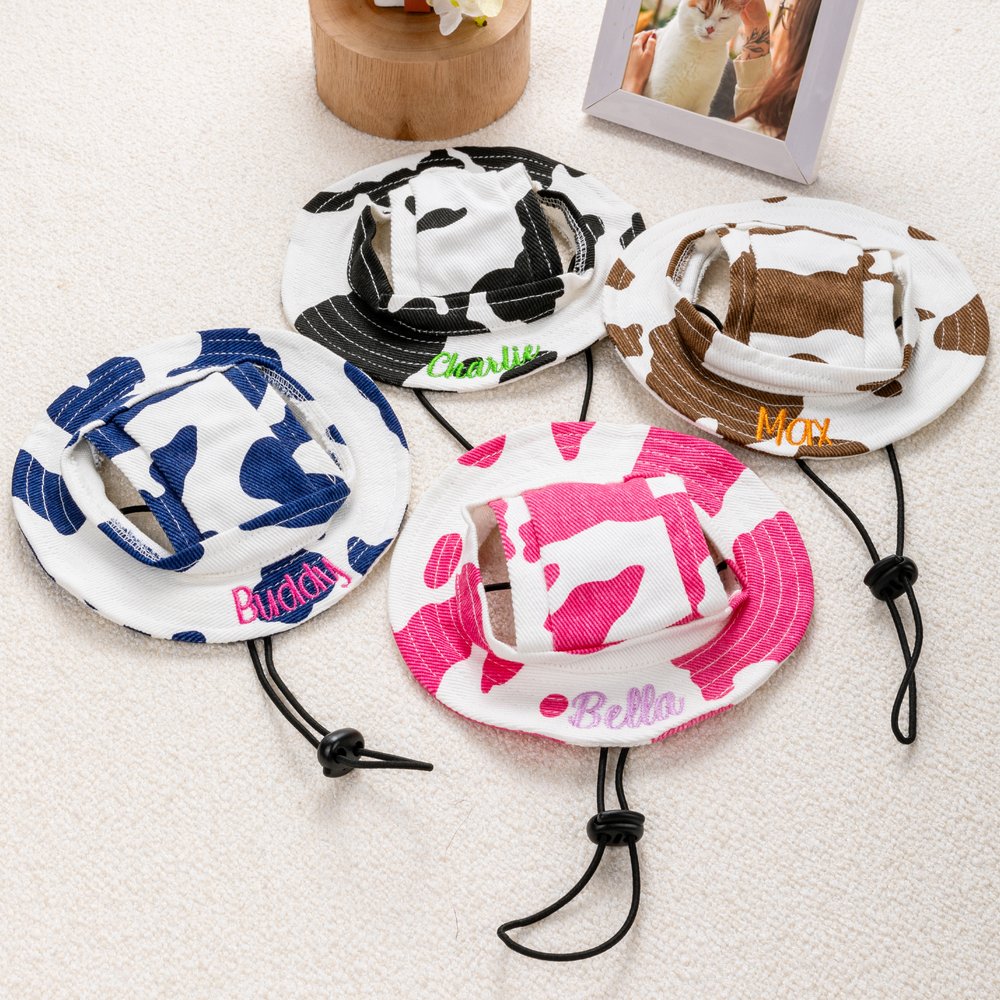 This charming bucket hat offers both playful and classic styles, featuring a cheerful multicolor milk pattern or a solid color. Available in three sizes to fit a wide range of pets, each hat is personally customized with your furry friend's name through delicate embroidery, creating a unique and special accessory just for them.