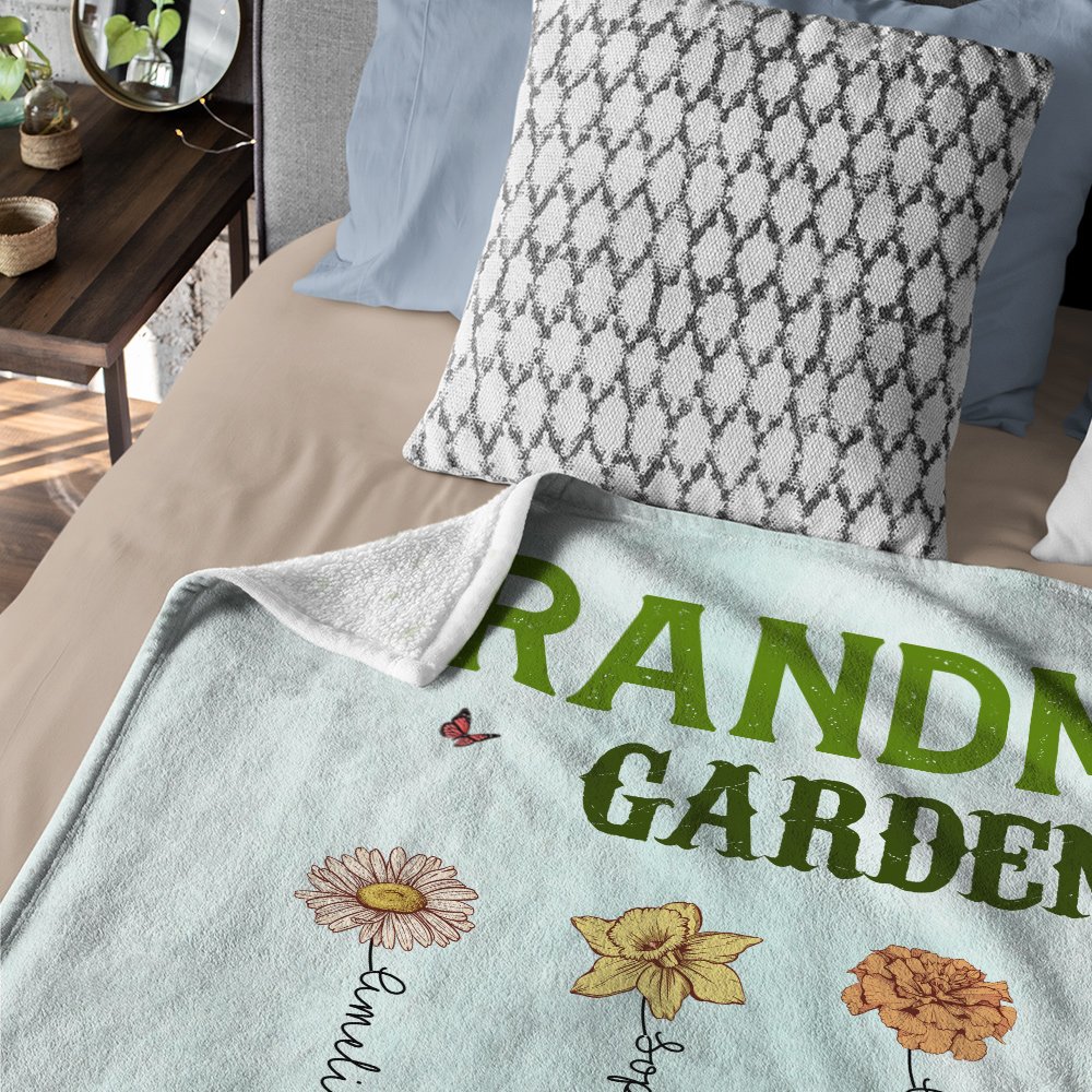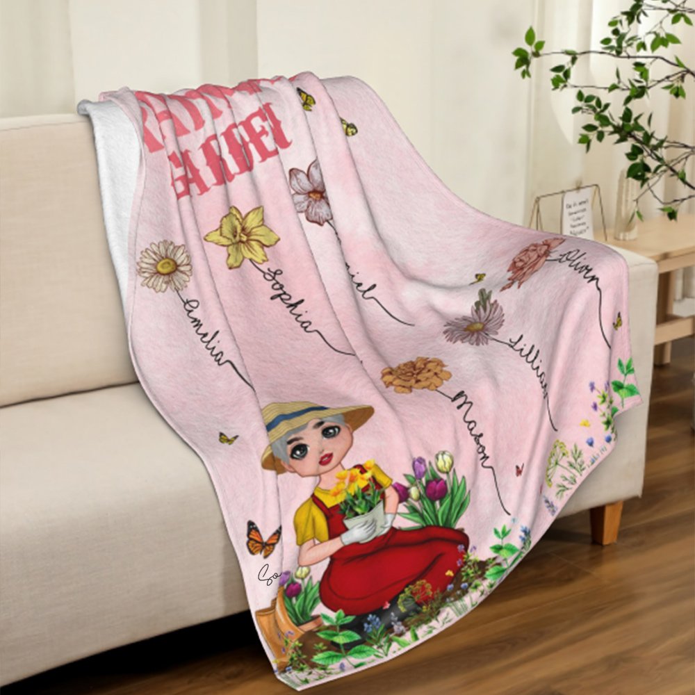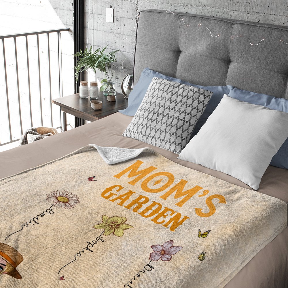 This blanket expresses deep love for the mother or grandmother with a vivid design. The names and birthday flowers of 1-12 children can be customized on the blanket. On the left is a hardworking cartoon gardener, symbolizing the "happy garden" carefully cared for by the mother. The colorful colors and warm patterns complement each other, making this blanket not only an everyday item but also a work of art that carries the warmth of the family.