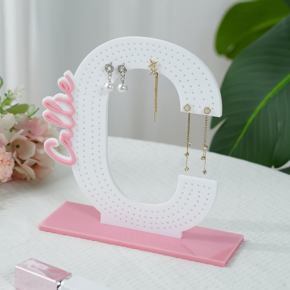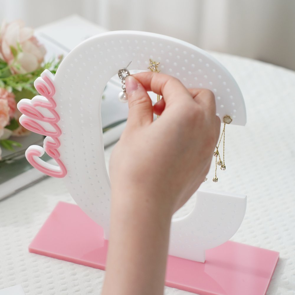 This earring holder features a combination of your name and initial, creating a simple yet artistic look. Each piece is custom-made for you and comes in a variety of color options. Whether displayed on a dressing table, desk, or display cabinet, it's a striking and sophisticated addition.