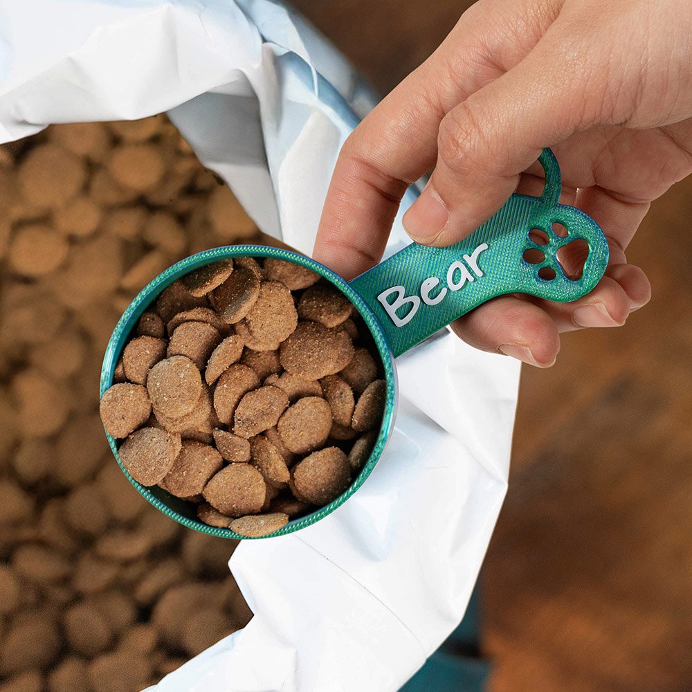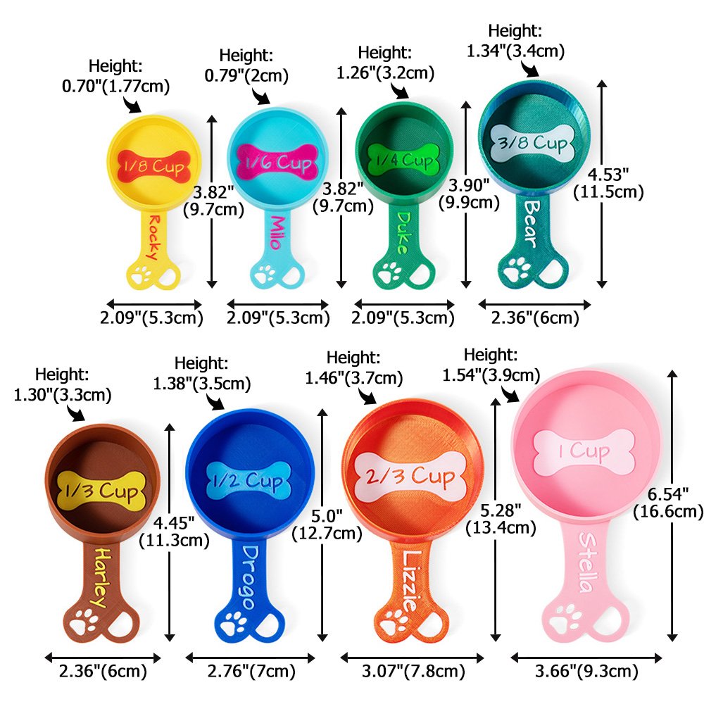 This pet food scoop perfectly combines the cute dog paw design of the pet with practical functions. Each food scoop is printed with clear patterns and names, and is equipped with clear scale marks, which not only increases the beauty of the dog food scoop, but also makes feeding more accurate and convenient.