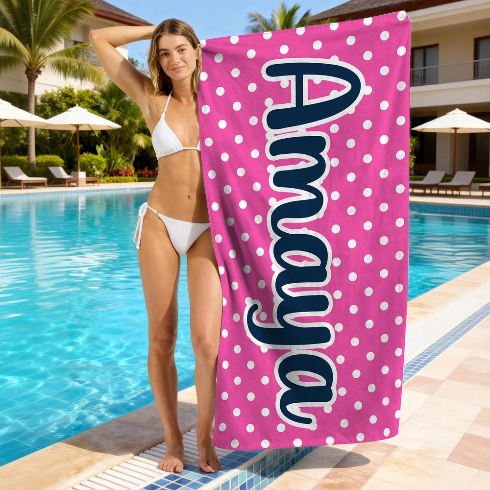 This round dot-pattern beach towel draws inspiration from classic retro and resort fashion. With a vintage-inspired polka-dot background, clean dot arrangement, and bold, playful colors, it combines nostalgic charm with vibrant summer energy. The centerpiece is a large, custom name in a stylish handwritten or retro font, enhanced with high-contrast outlines for clear visibility even from a distance — making your beach time truly personalized and eye-catching.