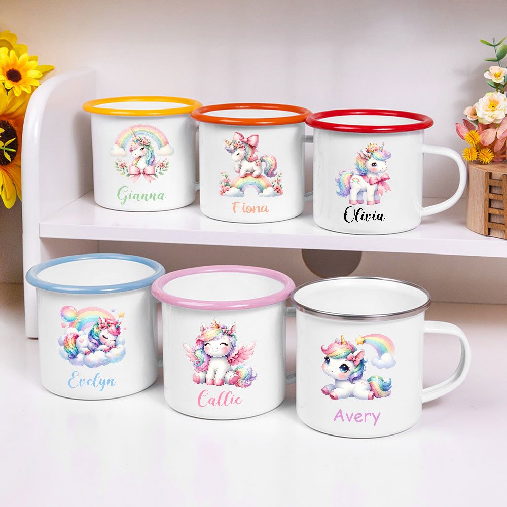 Each mug is carefully painted with a fantasy unicorn pattern, with rainbow and bow elements, bringing endless space for children to imagine. The mug body can be customized with the children's names so that an exclusive feeling. A variety of color options, such as pink, blue, etc., to meet the children's different personalized needs.