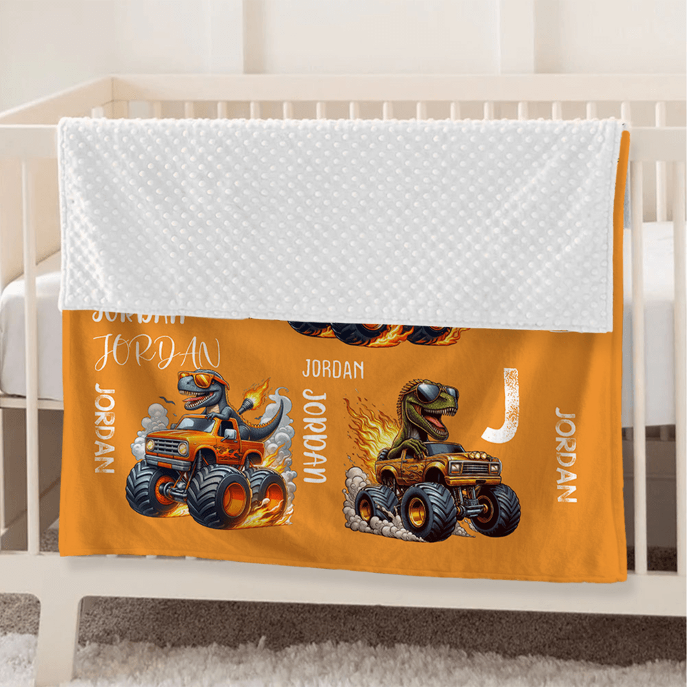 Fuel your child's imagination with this vibrant multicolor blanket featuring a dynamic combination of mighty dinosaurs and rugged monster trucks. The exciting design is personalized with your child's name and initial, creating a one-of-a-kind piece that perfectly captures their unique personality and interests.