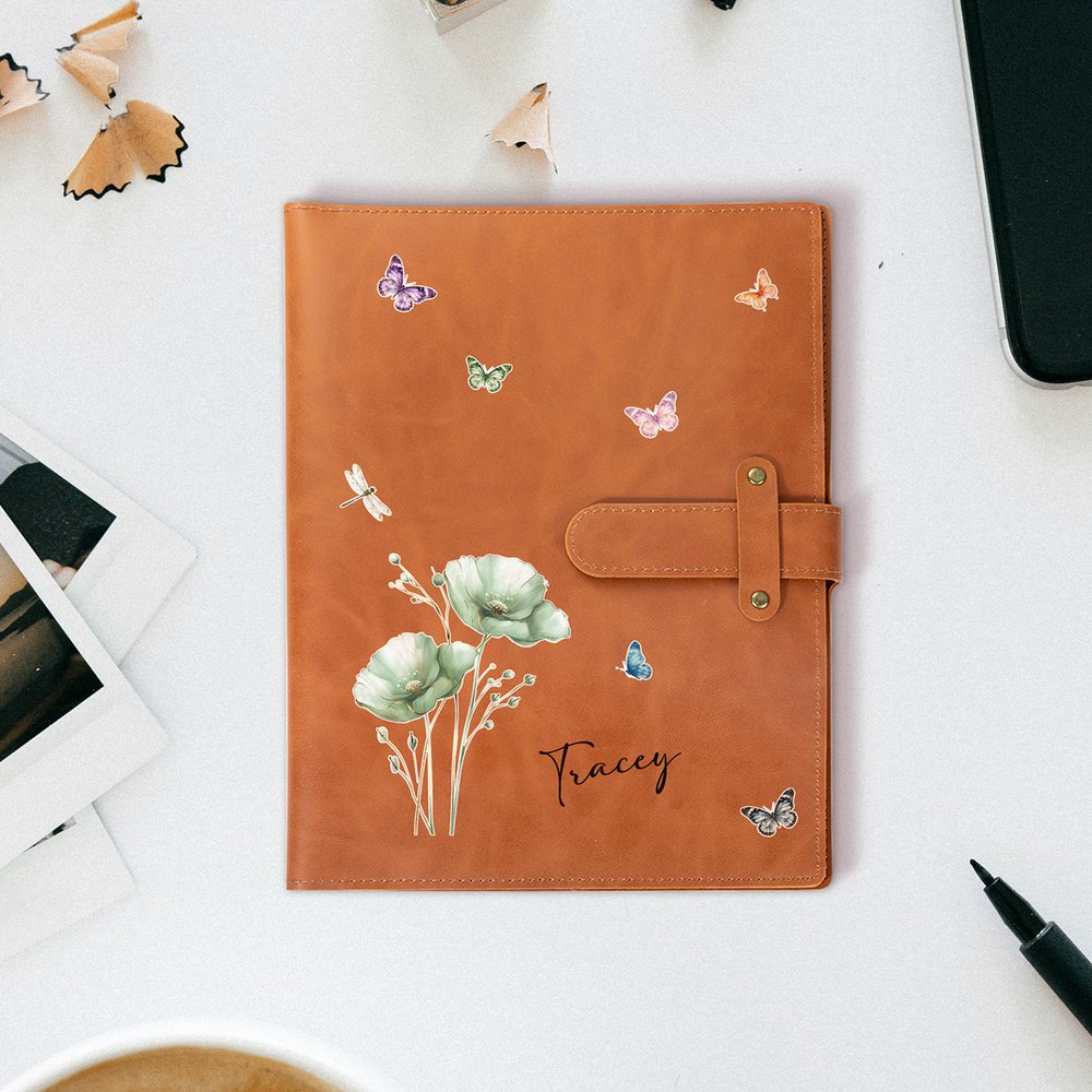 This notebook features a collection of 16 watercolor flowers, delicately accented with butterflies and dragonflies for a fresh, artistic vibe. The option to add a personal name transforms it into a unique accessory that reflects individual style.