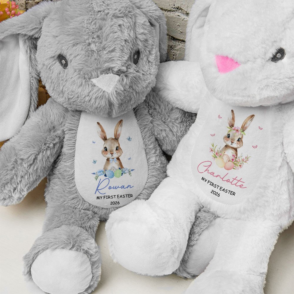 Celebrate your little one's first Easter with our adorable personalized plush bunny! Choose from two adorable and playful bunny designs: one with pink flowers and butterflies, and one with a blue bow surrounded by birds and butterflies. Such a cute design will definitely attract children's attention.