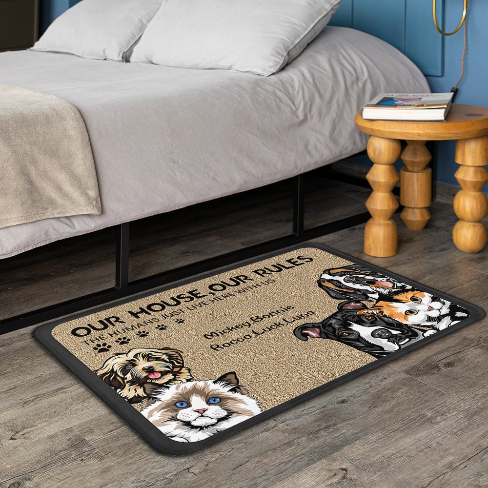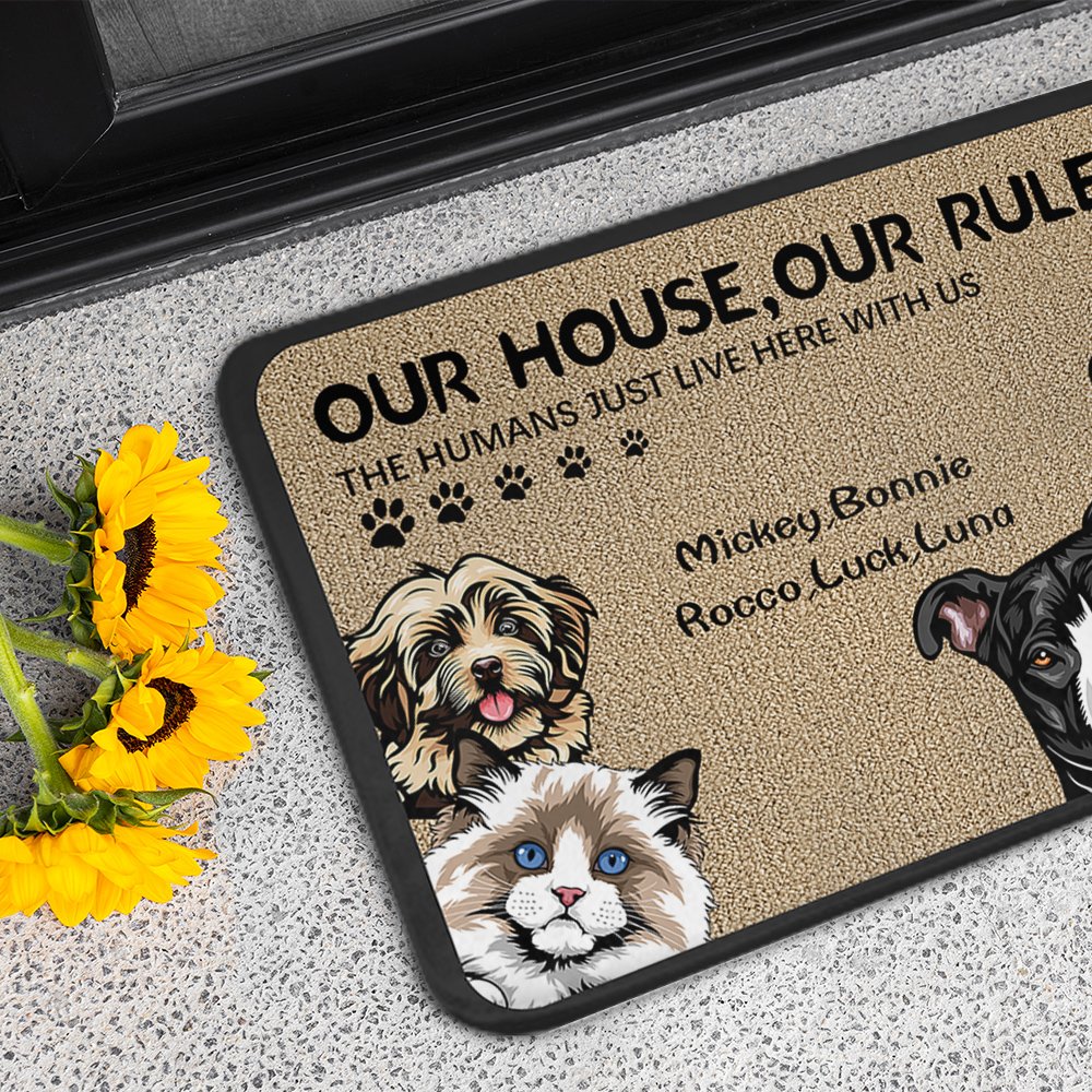 We printed "Our/My House,Our/My Rules The Humans Just Live Here With Us/Me" on the doormat. The fun and witty message adds interest to the doormat and expresses pet owners' love for their furry friends.