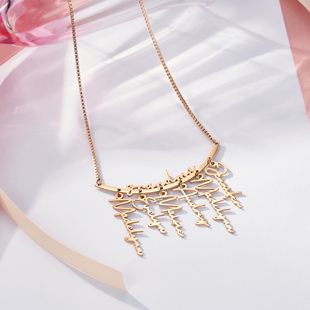 This exquisite necklace allows you to personalize it with the names of 1 to 7 family members, and the name pendant is hung on the necklace through a ring, creating a unique sense of beauty and art. You can also customize the necklace with a title such as "Mom" to perfectly express your love.