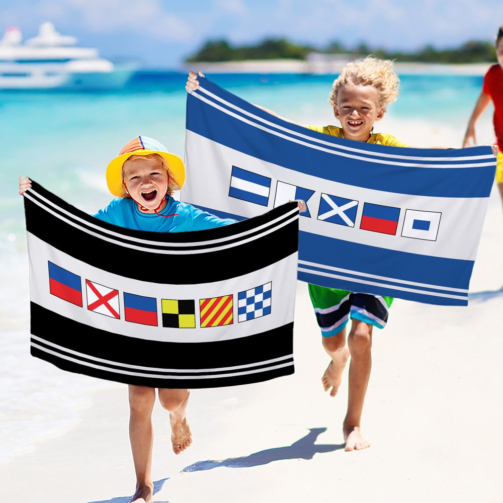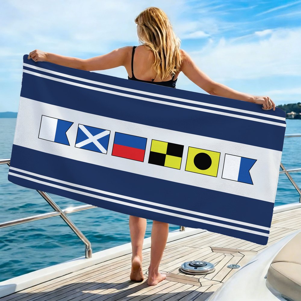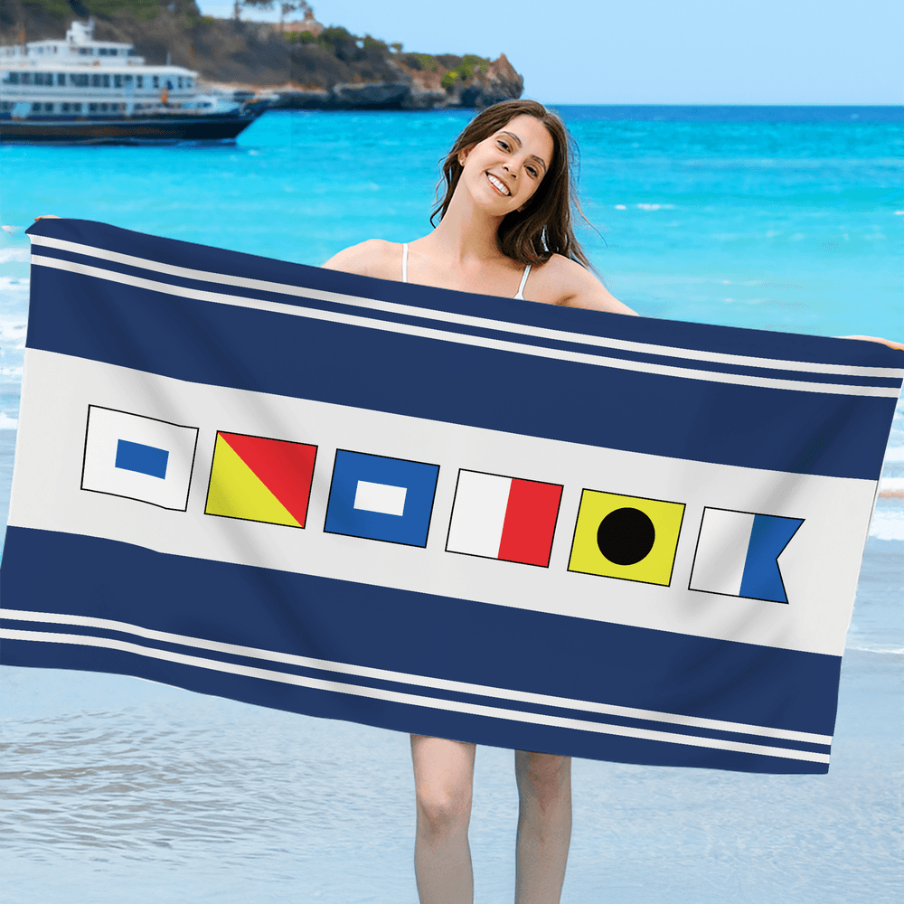 Themed around classic nautical flags, this beach towel features various colored stripes and a personalized name, exuding a marine vacation vibe. Visually refreshing and eye-catching, it's a highly personalized and distinctive gift, perfect for personal use or as a present.