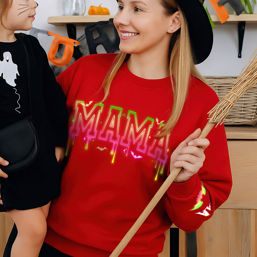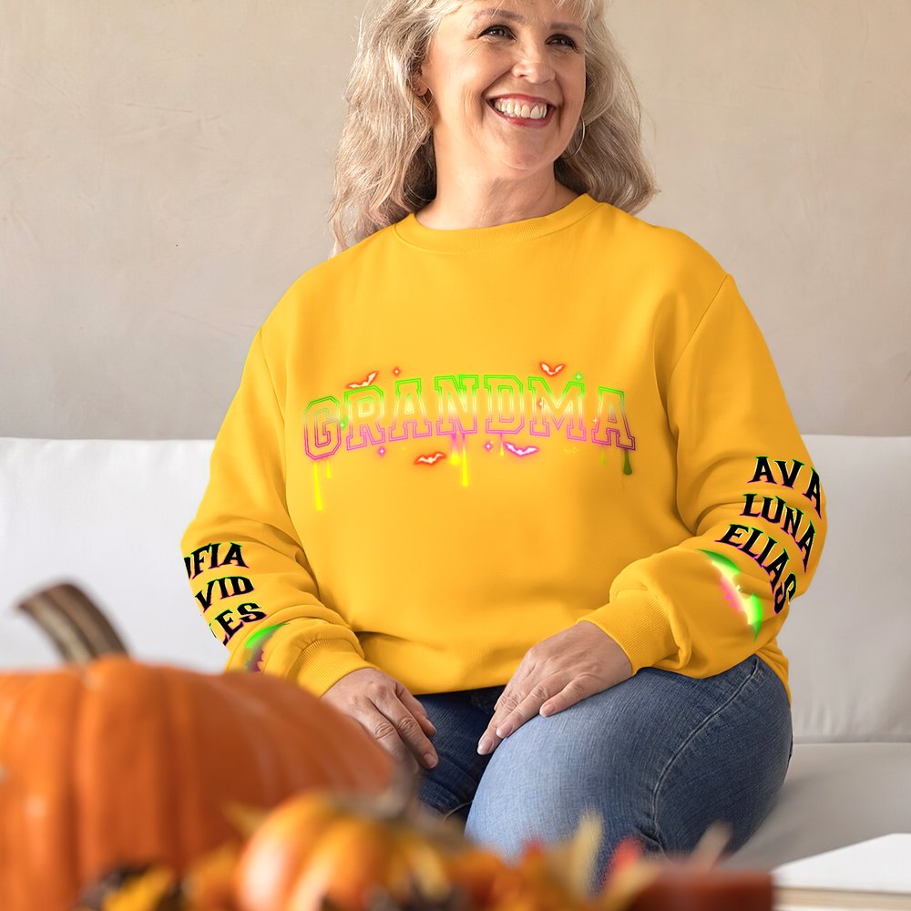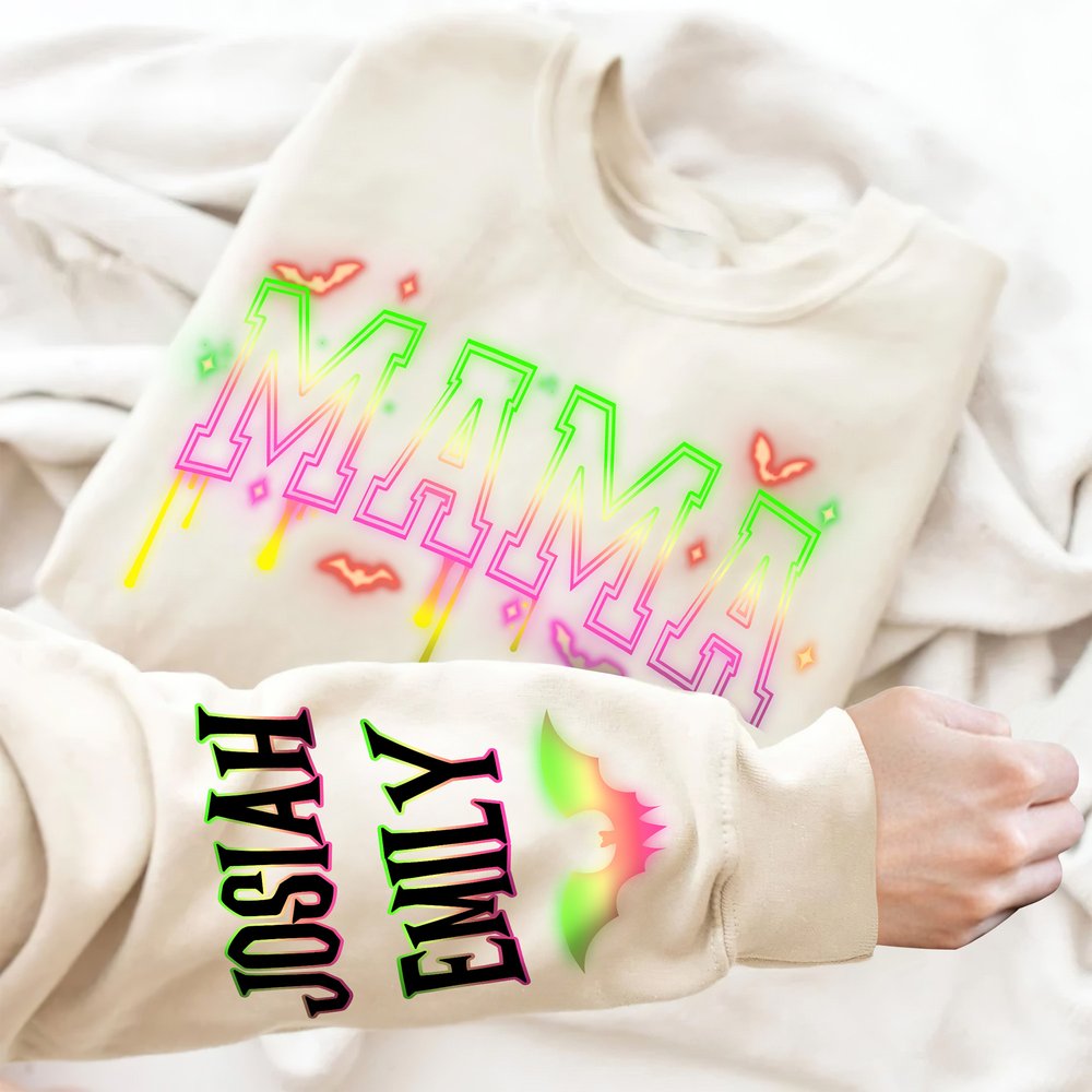 Our sweatshirt features a dazzling neon effect and decorative patterns featuring bats, stars, and other Halloween motifs, perfectly capturing the Halloween spirit. You can customize the front of the sweatshirt with title and the sleeves with 1-6 names to represent your family, fostering family cohesion and adding festive cheer to any Halloween event.