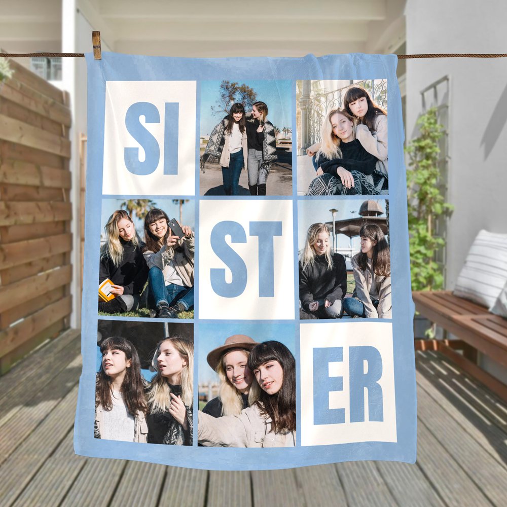 Centered around the "SISTER" or "SIS" letters, heartwarming 6 photos of sisters are embedded into the various squares, complemented by a flexible color palette, breaking the monotony of ordinary blankets. This blanket becomes a carrier of memories, showcasing both individuality and sisterly love, allowing you to relive beautiful moments with every use.