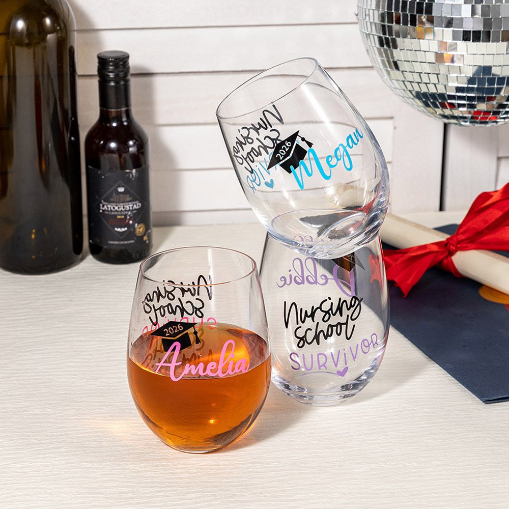 The glass features the humorous phrase "Nursing School Survivor." It brings a lighthearted atmosphere to the celebration and highlights the graduate's resilience and determination.