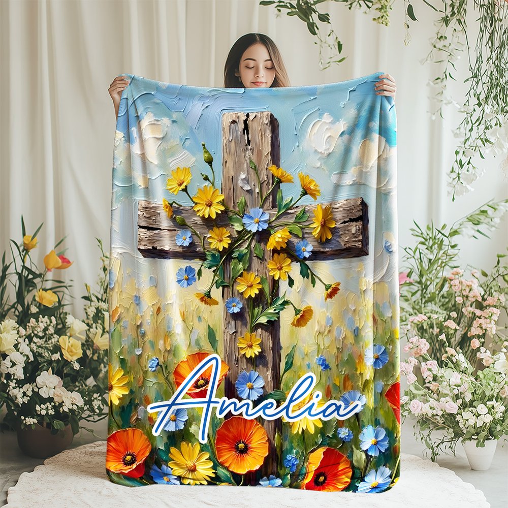 This blanket features a Christian cross as its central design element, complemented by colorful flowers. Its classic oil painting style creates a soft and elegant visual effect, exuding a warm and inviting feel. Customization with a personal name is available, perfectly blending individual identity with religious elements. Combining aesthetic appeal with a sense of faith, it precisely meets the spiritual needs and aesthetic preferences of Christians.