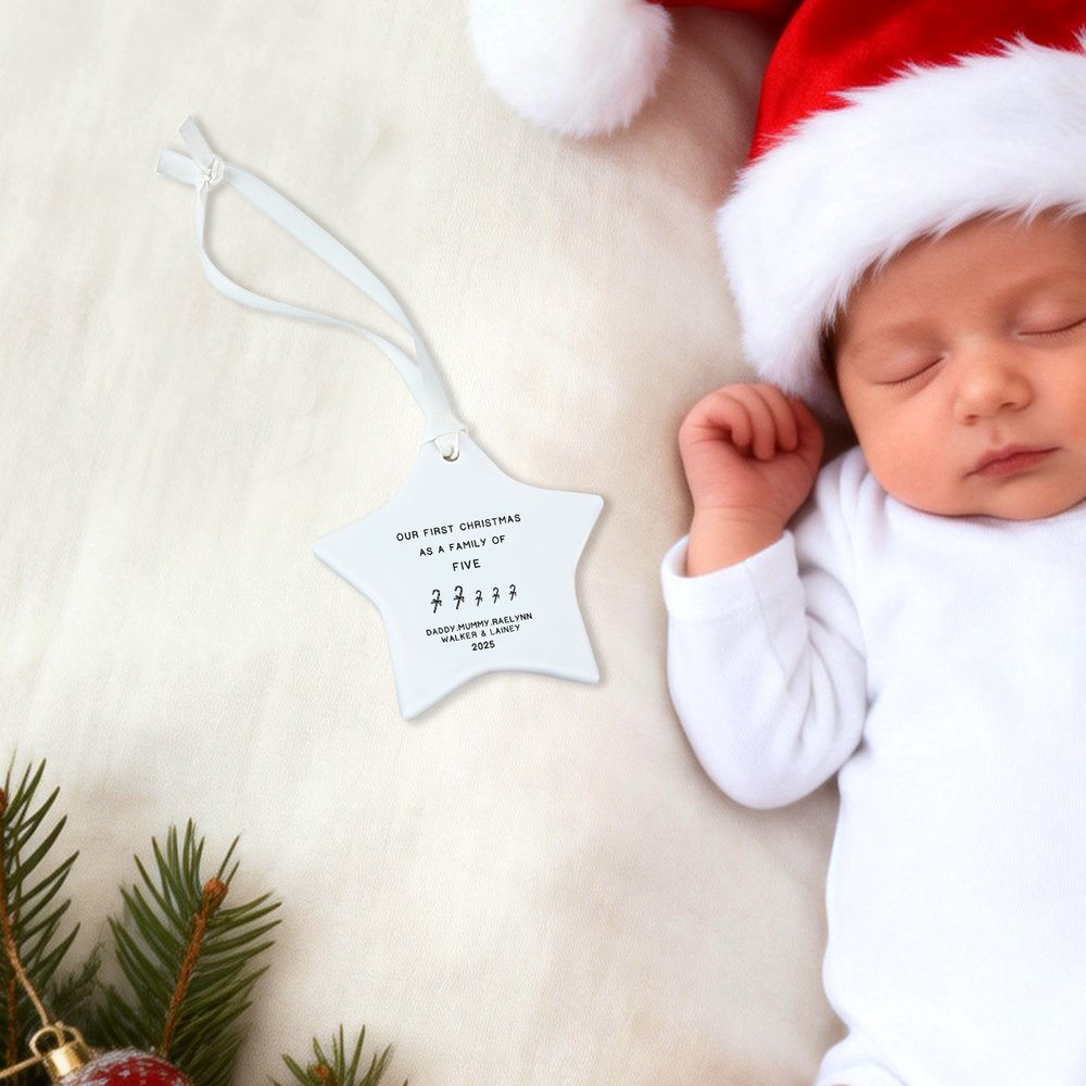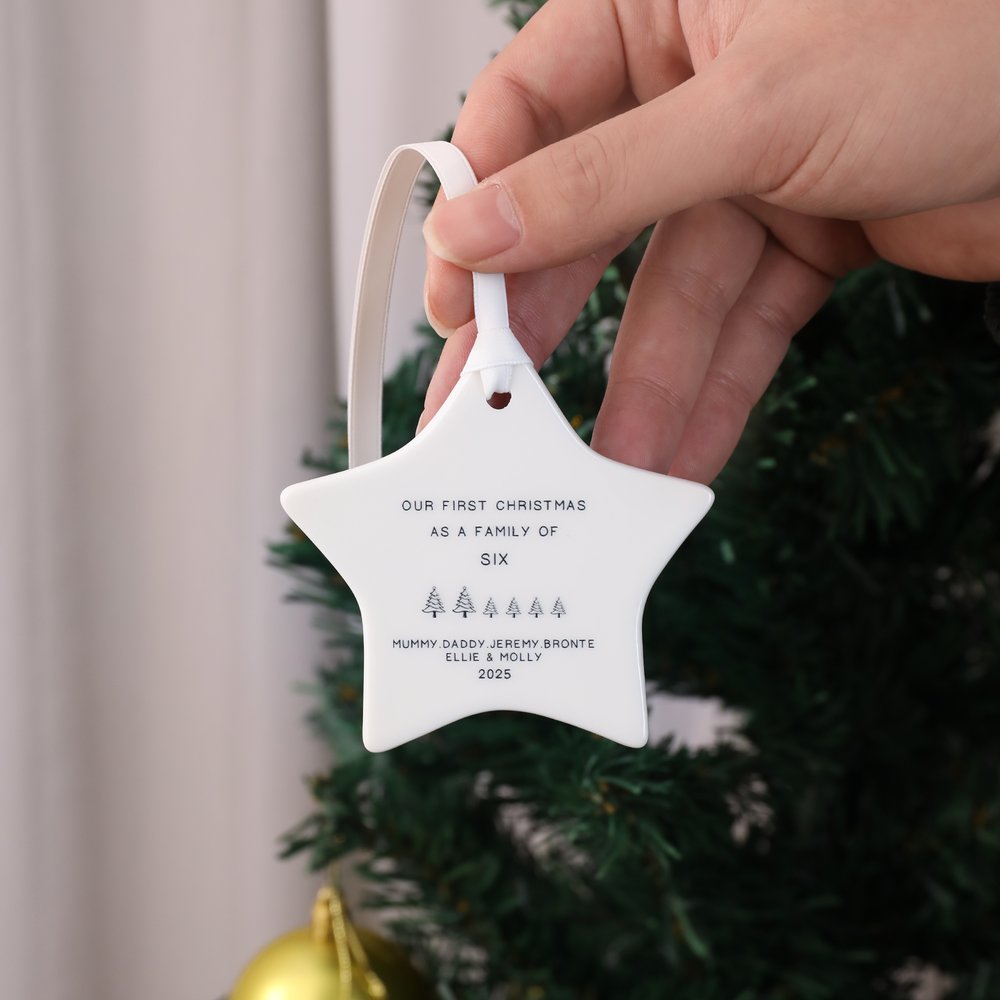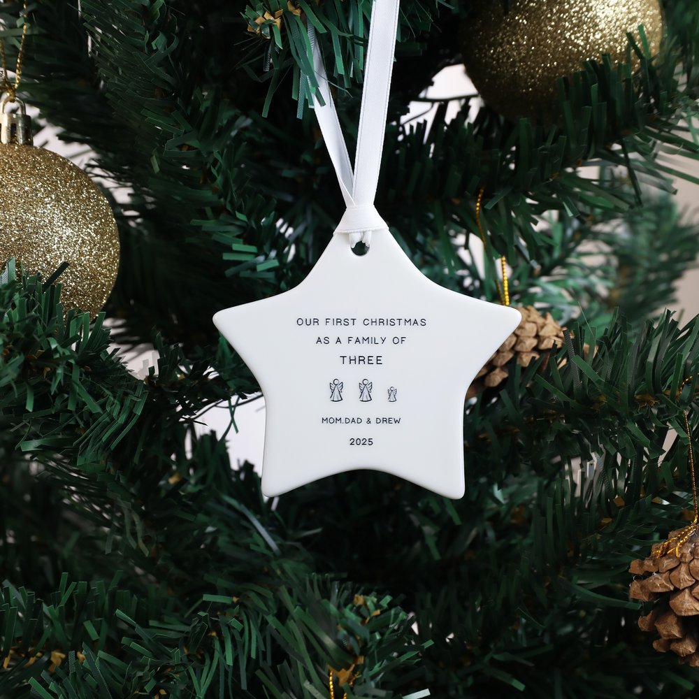 Celebrate a meaningful milestone with this minimalist star-shaped “Our First Christmas as a Family” ornament. Personalize it with your family members’ names and the year to create a one-of-a-kind keepsake that captures the warmth of the season. Choose from a variety of festive theme designs—such as Christmas tree, gingerbread man, Santa, angel, twinkling stars, reindeer, or snowman—to perfectly match your holiday style.