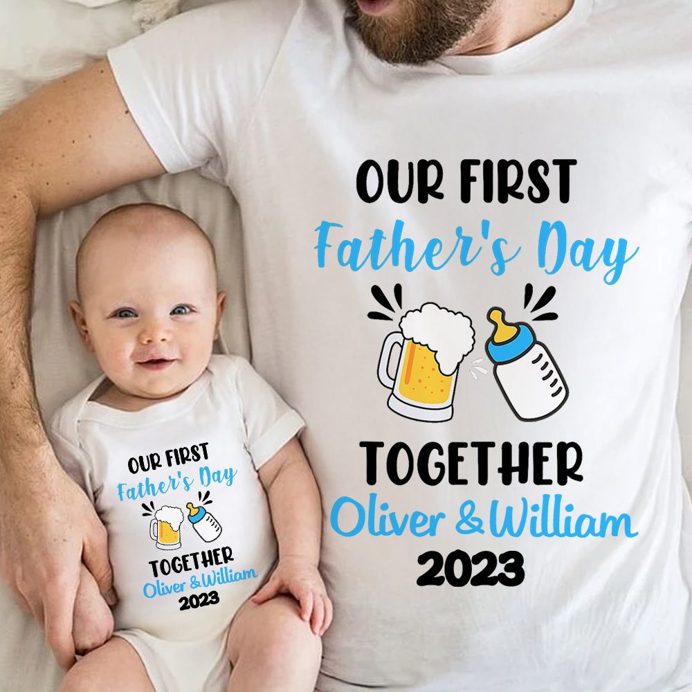 Our clothing is themed with beer and baby bottles, and is accompanied by a heartwarming quote, "Our First Father's Day", conveying the warmth of fatherly love and family affection. In addition to customizing the father's name, you can also customize the baby's name and birth year to record this precious first Father's Day or newborn moment.
