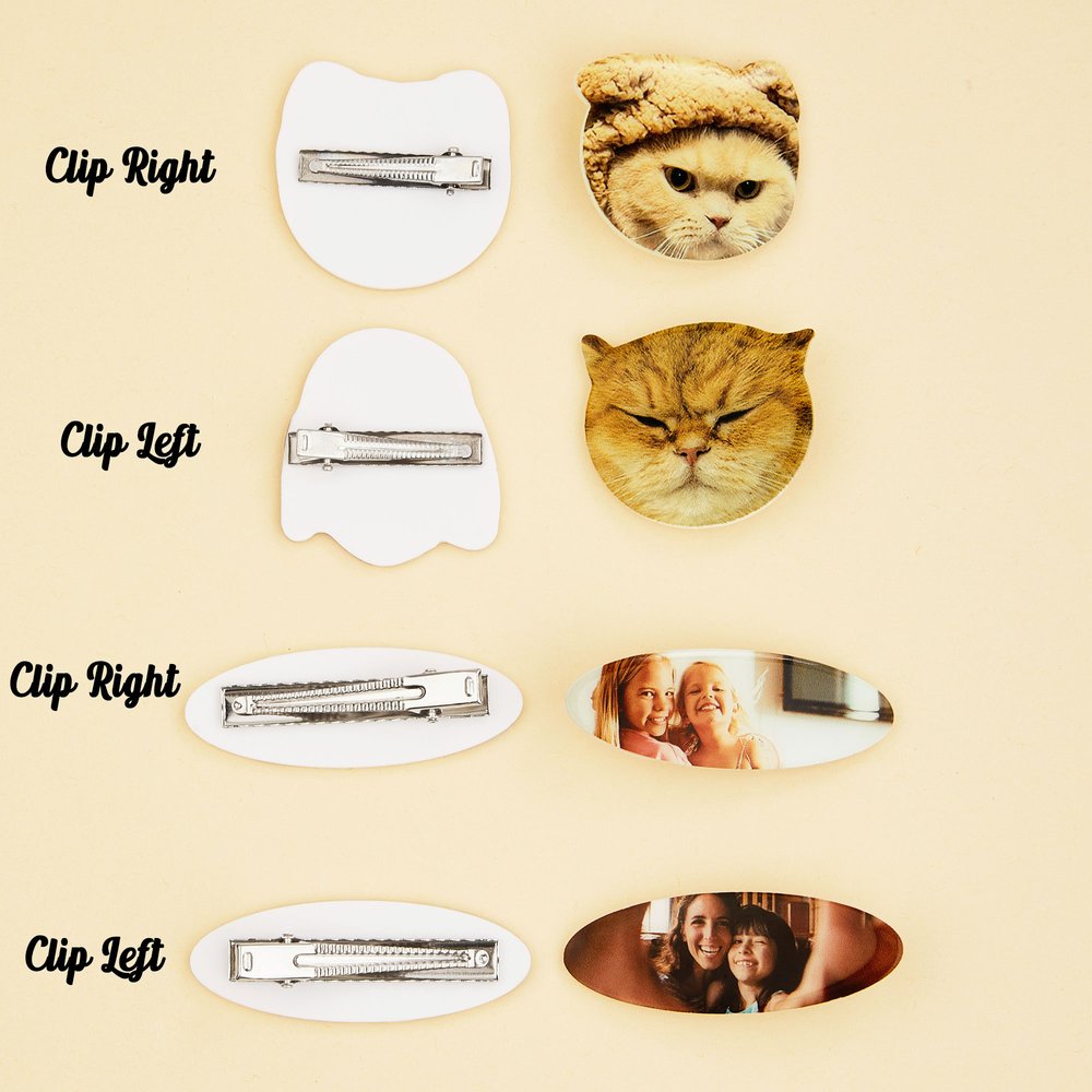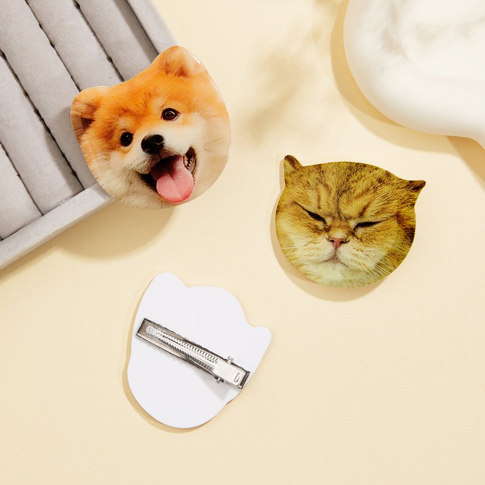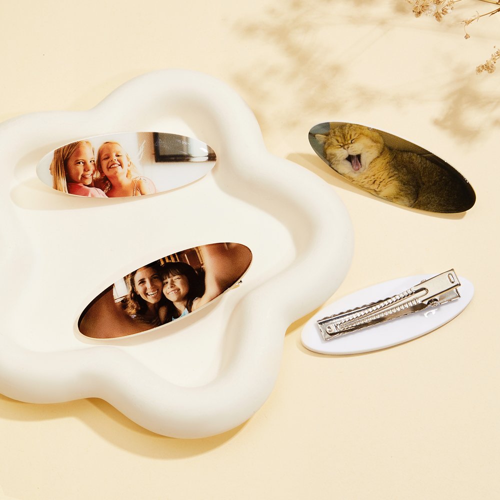 The unique feature of these hair clips is their personalized customization—each one is meticulously crafted, adorned with your photo or your beloved pet, showcasing their image with stunning detail and ensuring your one-of-a-kind companion becomes the center of attention. Whether you own a lively puppy or a playful cat, these hair clips allow you to fully express your pet's charm and bring a smile to everyone who sees them.