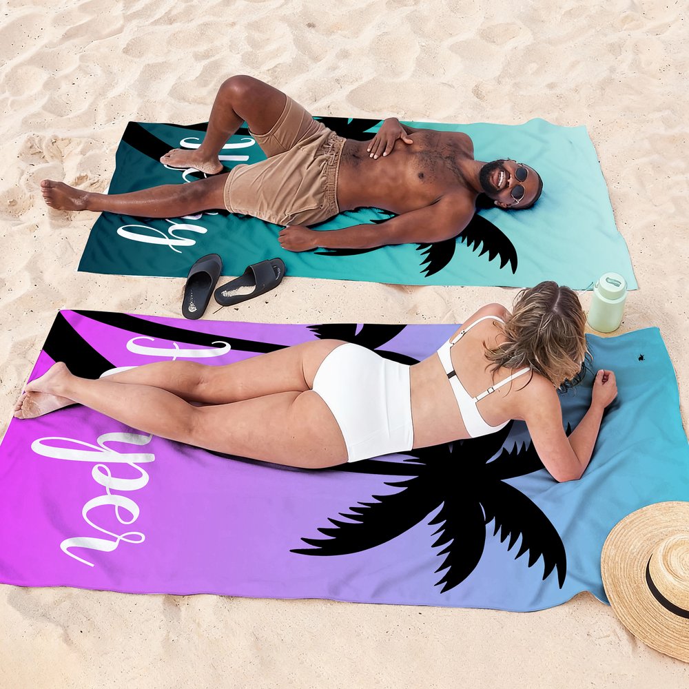 Visually, the towel has a bright, tropical style. Its bold gradient background features a sleek black palm leaf silhouette, with your name below. The design blends vibrant summer hues with laid-back tropical charm, creating a towel that’s both functional and a stylish statement piece for any sunny setting.