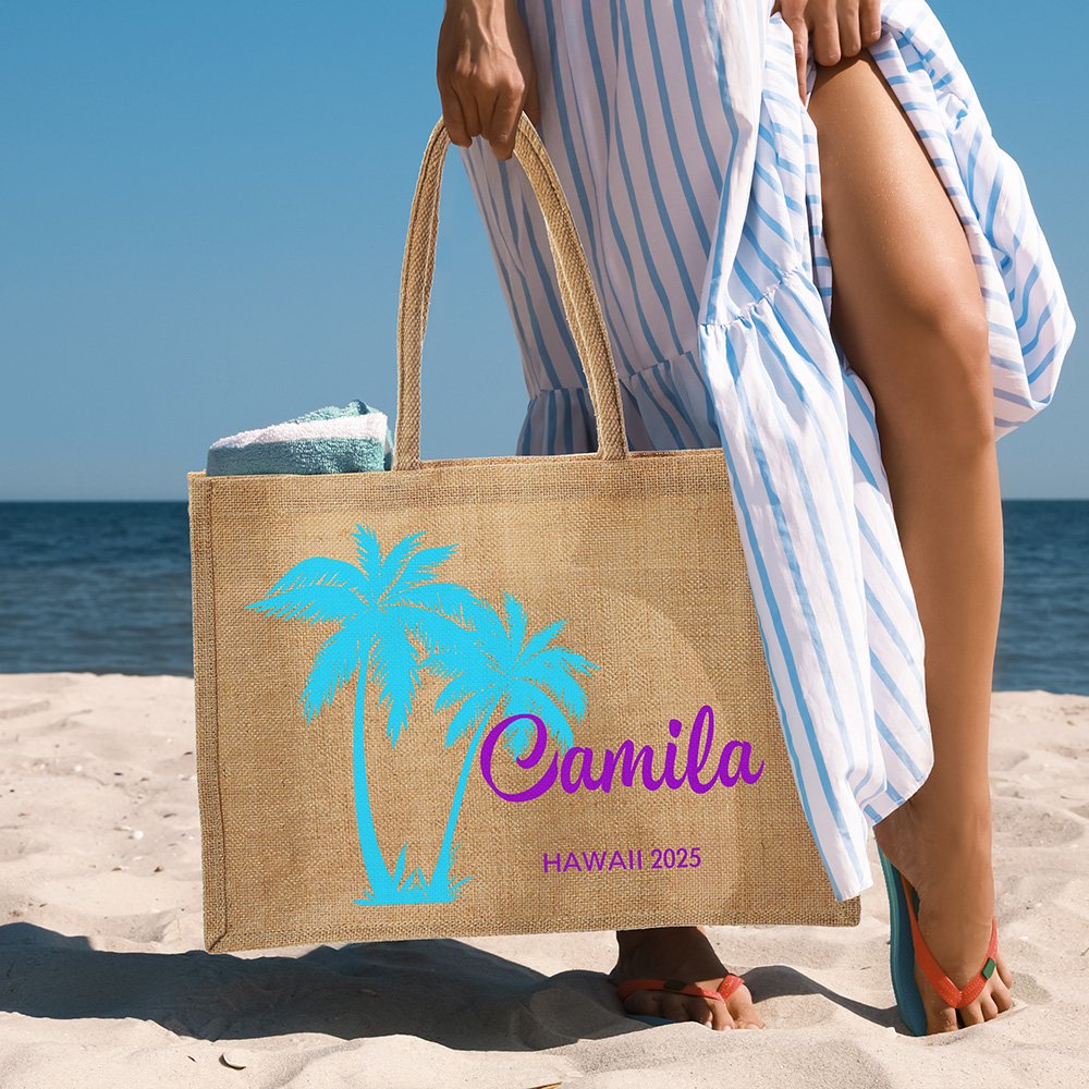 Personalized Palm Tree Large Jute Tote Bag with Name and Text Travel Accessories Birthday Beach Party Wedding Gift for Women Bridesmaids