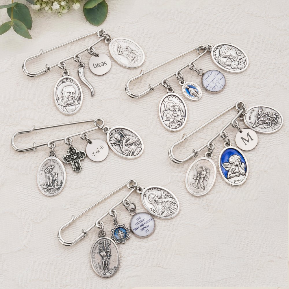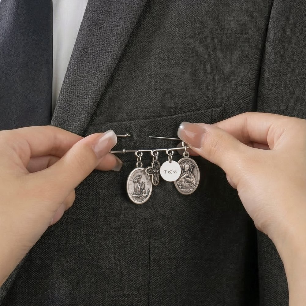 Personalized Patron Saint Lapel Pin with Initial Name and Text Wedding Keepsake Wedding Birthday Gift for Groom Catholics