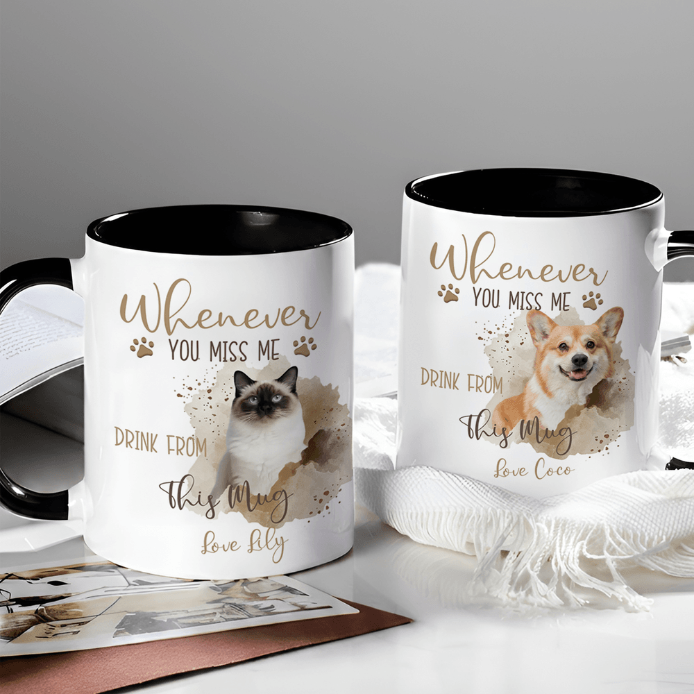 This charming ceramic mug features a customizable watercolor design that incorporates photos of beloved pets, alongside paw prints. This unique design celebrates the bond between pet owners and their furry friends, making it a heartfelt addition to any kitchen or workspace.