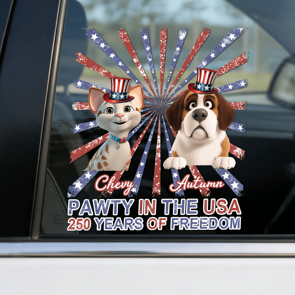 Designed to celebrate America's 250th anniversary, this car decal features a dynamic background of red and blue radial stripes that create a festive and joyful atmosphere. At the center, you can customize it with 1–2 cartoon pets, rendered with lively expressions and fine attention to detail. You can also add your pet's name, giving your vehicle an instant touch of personality and warmth.