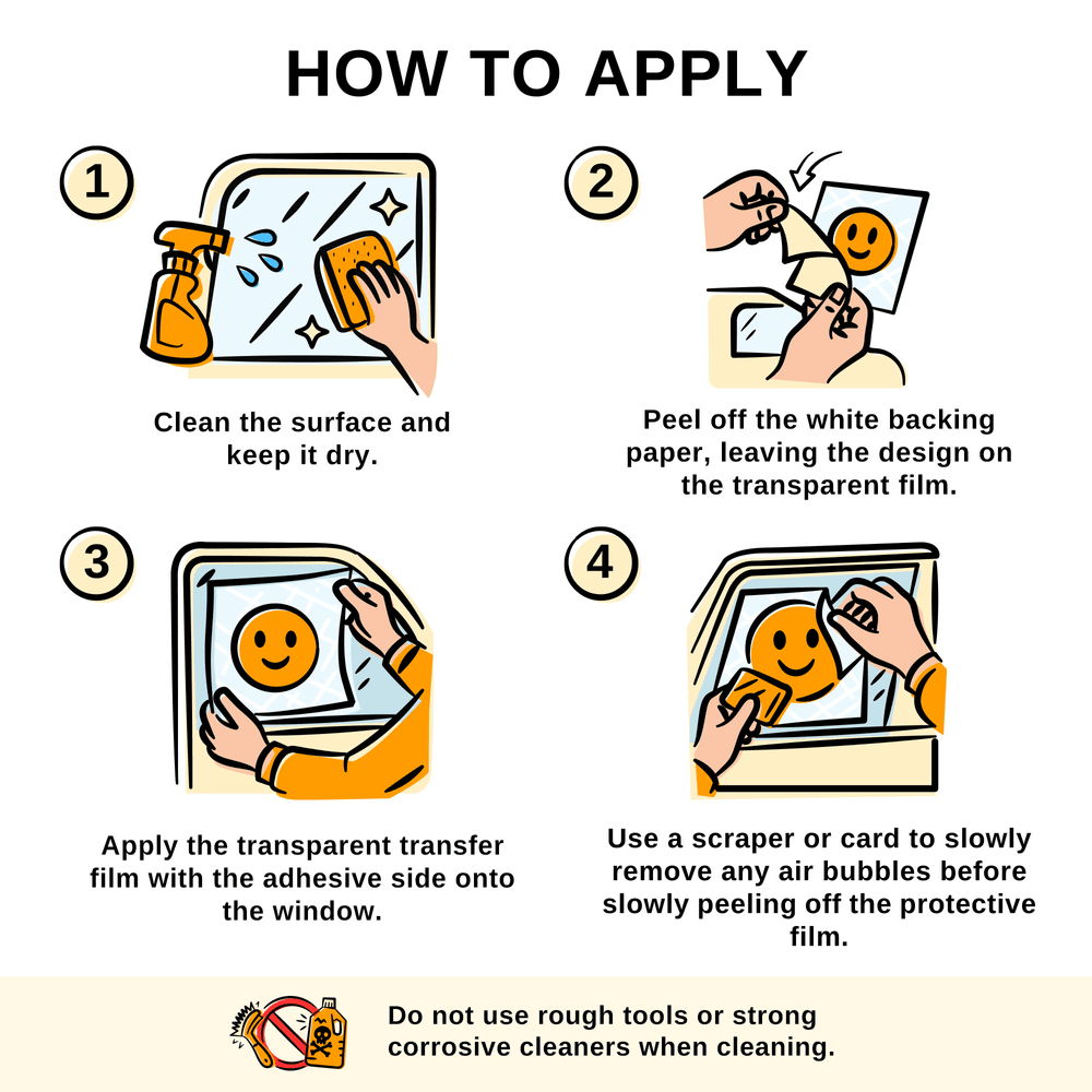 1. Clean the surface and keep it dry. Avoid using rough tools or strong corrosive cleaners when cleaning. 2. Peel off the white backing paper, leaving the design on the transparent film. 3. Apply the transparent transfer film with the adhesive side onto the window. 4. Use a scraper or card to slowly remove any air bubbles before slowly peeling off the protective film.