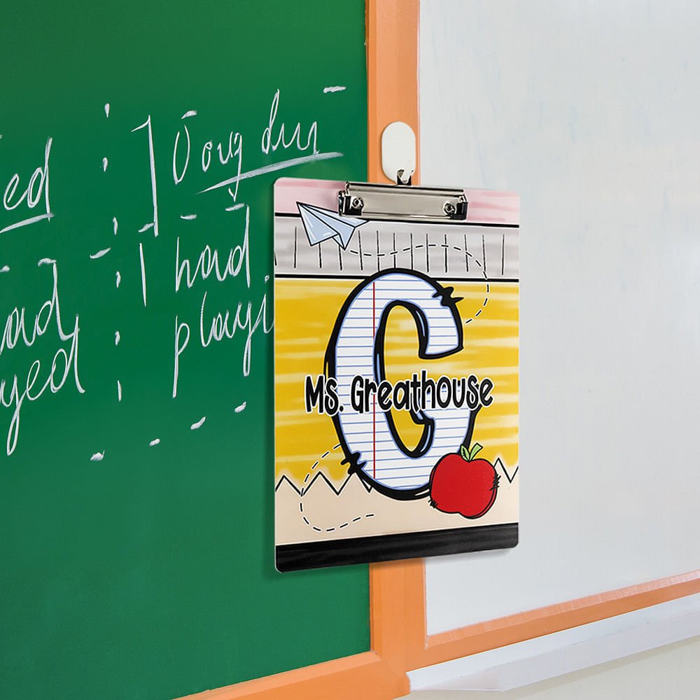 The entire clipboard design uses pencil elements, the center of the board also has a notebook line formed by an initial, and the name can be customized, surrounded by apple and paper planes. The whole picture of the board is colorful and lively. The use of various patterns increases its visual appeal and interest.