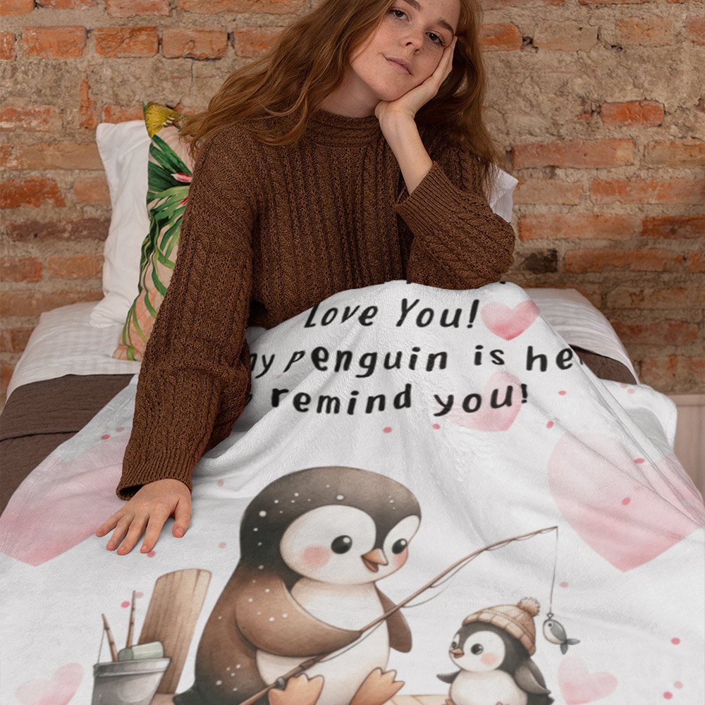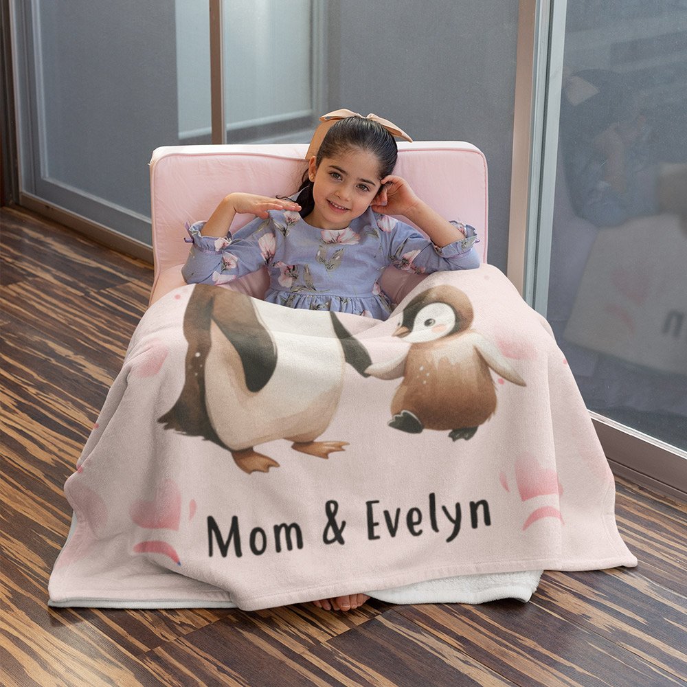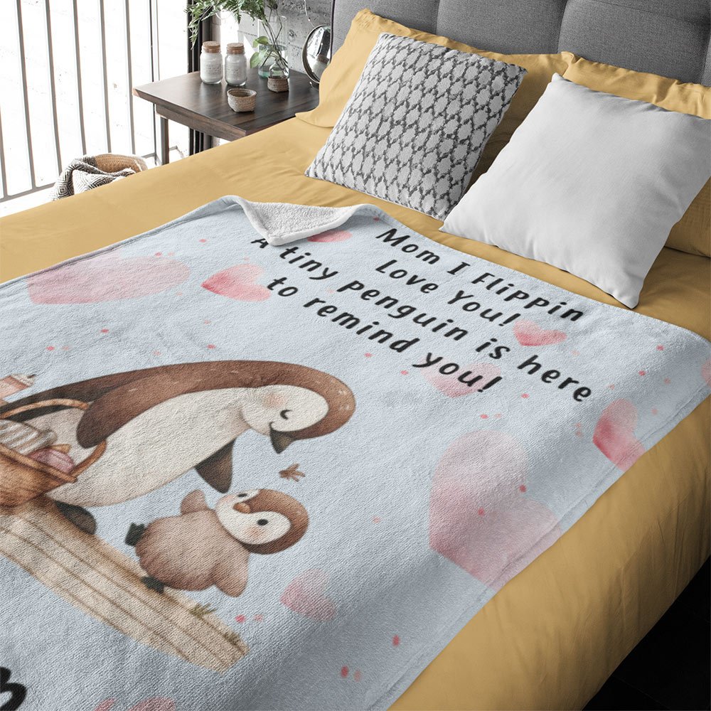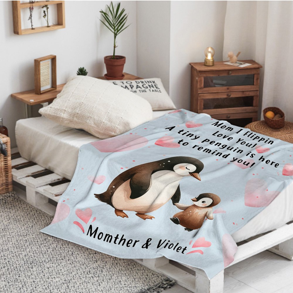 This blanket features a cute penguin mom and child design with many watercolor hearts in the background and the text "Mom I Flippin Love You! A tiny penguin is here to remind you!". The picture is warm and thoughtful. You can personalize any text to create a unique home essential.