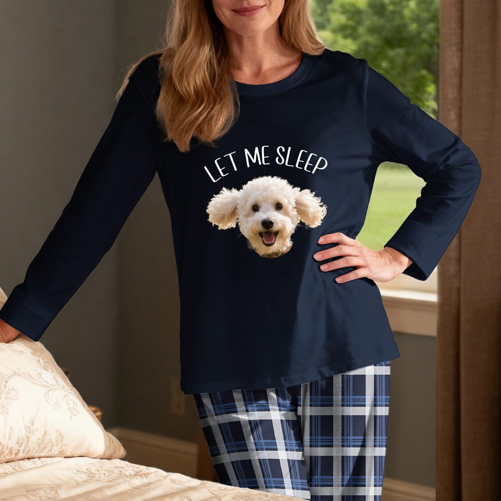 This pajama set features customizable pet face photo prints and a personalized text. The long-sleeve top + plaid pants combo lets you turn your furry friend into a cozy fashion statement, making every loungewear moment unique.
