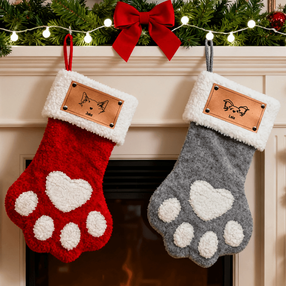 Inspired by adorable pet paws, this Christmas stocking comes in two classic colors: red and gray. Featuring charming heart-shaped paw pads, it adds a playful touch to your holidays. The cuff can be customized with a line-style pet ear pattern and your pet’s name, making each stocking one of a kind—a heartfelt way to blend love for your pet with festive cheer.