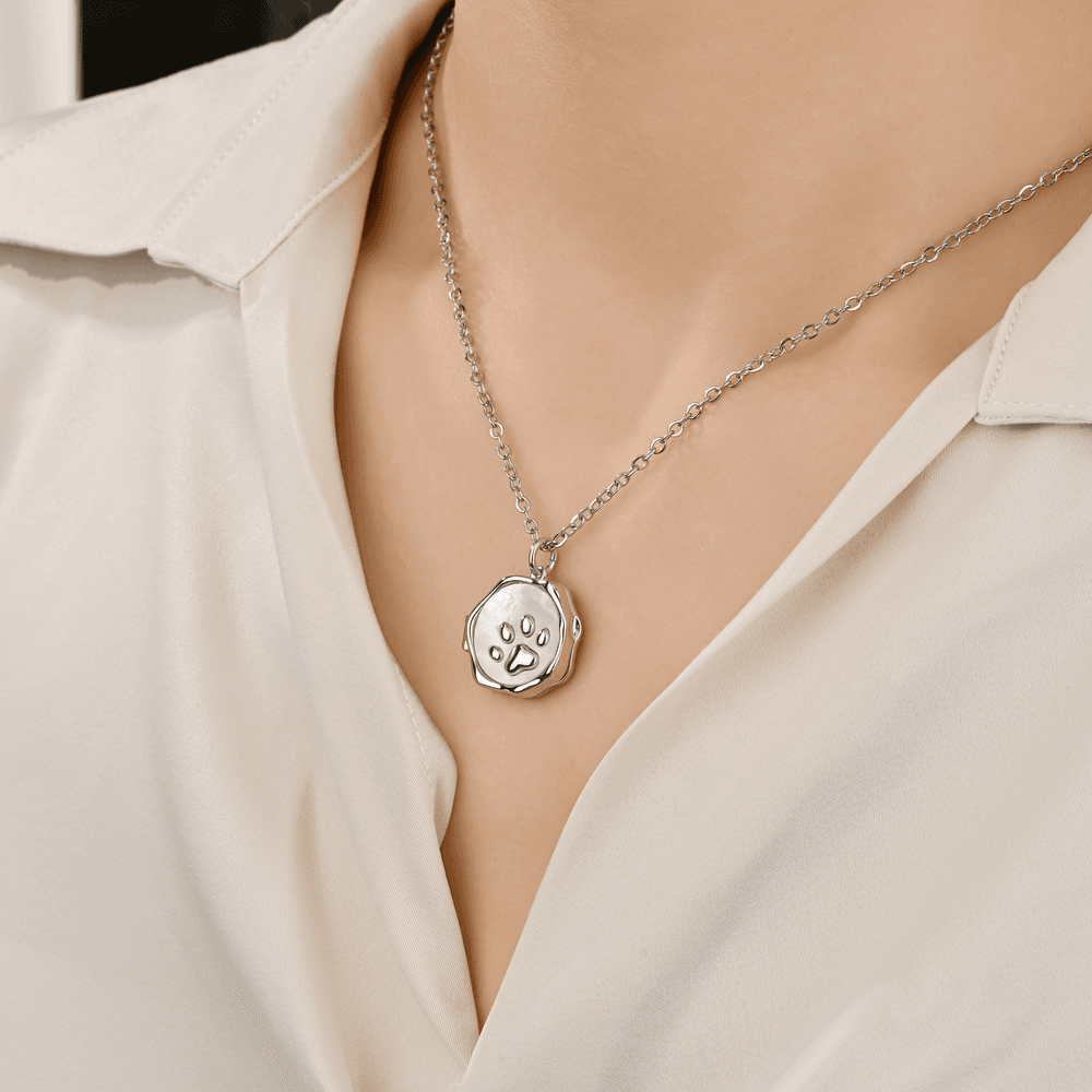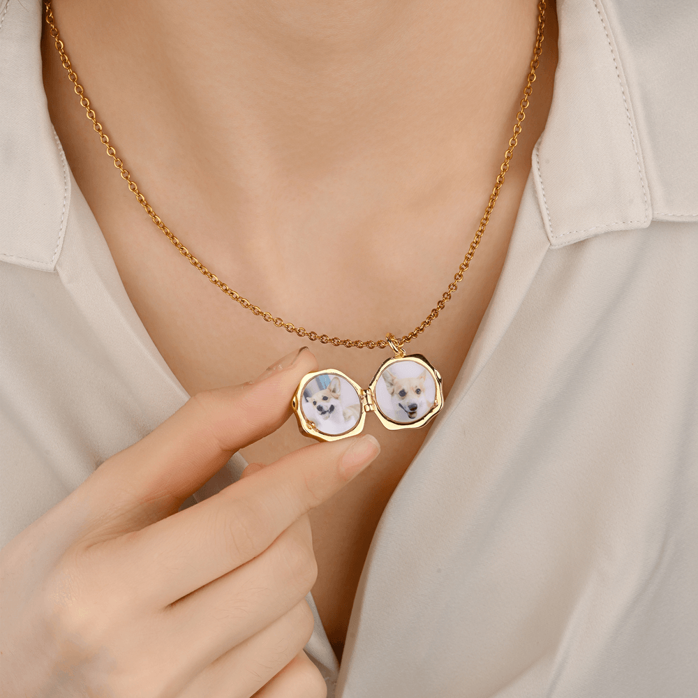 This meaningful pet photo necklace comes in two elegant finishes: white gold-plated and gold-plated brass, crafted in the shape of a delicate pet paw print. When opened, the locket reveals a custom space for 1–2 cherished photos of your furry friend, creating a discreet and sentimental keepsake that’s both personal and stylish.