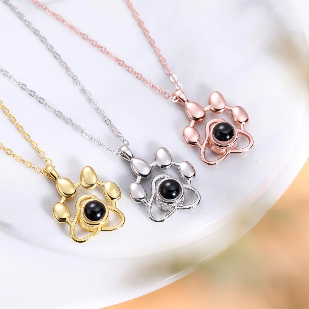 •Offer a sweet and meaningful gift for dog owners with a necklace that is with puppy feet inlaid with a projection gemstone, which uses the hollowed-out claws as a creative and fun symbol of your puppy and displays photos through projection or mobile phone camera.