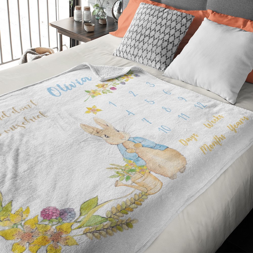 The product combines the elements of peter rabbit, and this design makes this blanket full of novelty and fashion. We have added the option of customizing the name to make this blanket more unique.