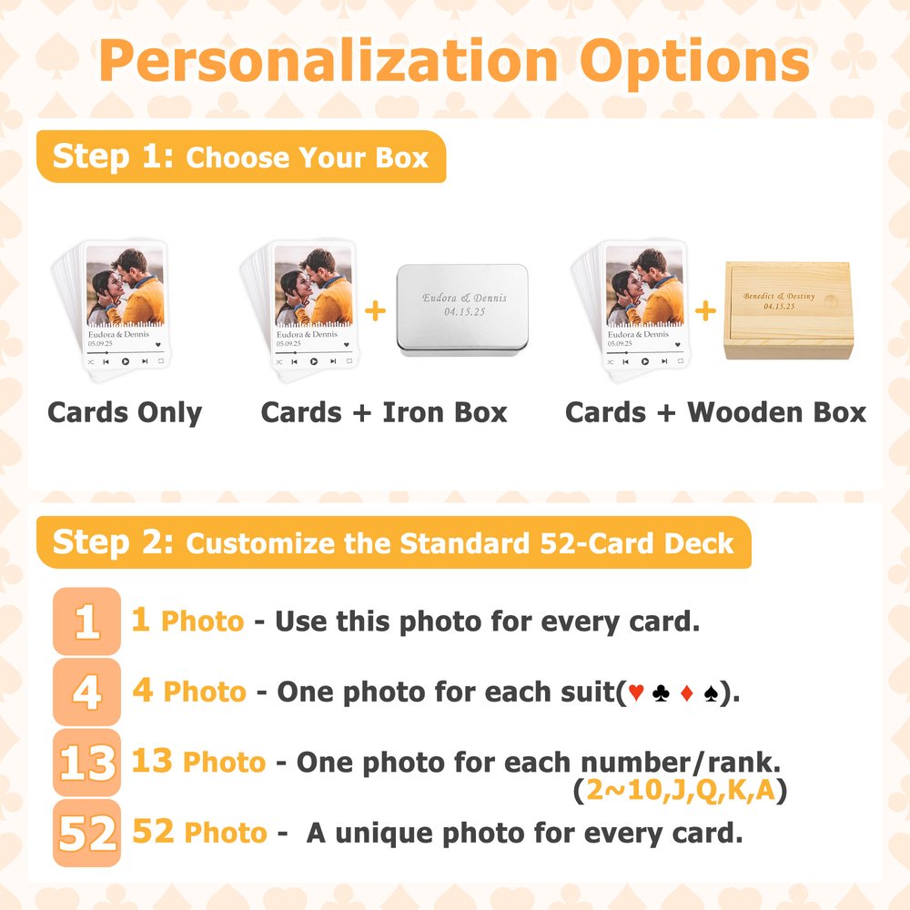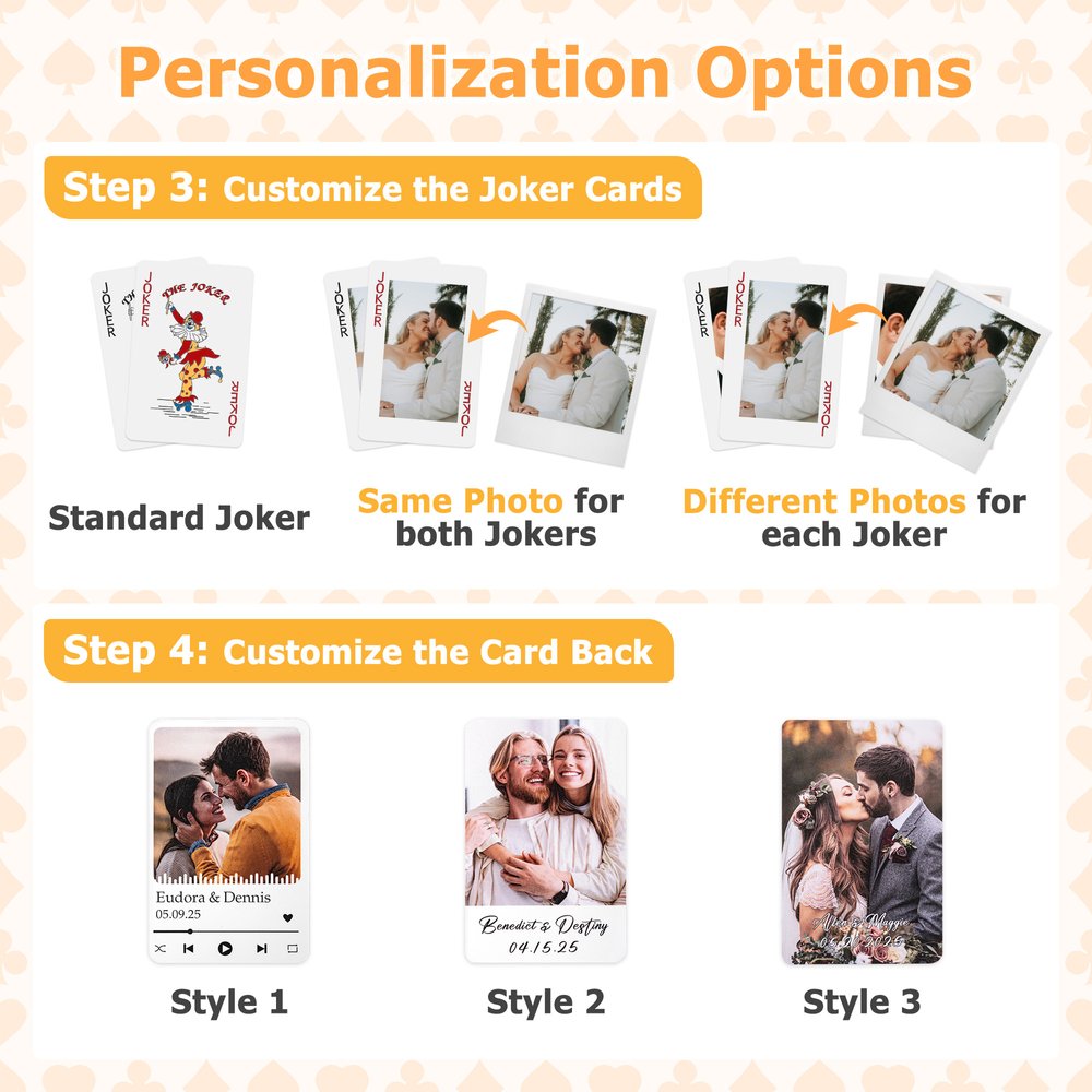 All 52 cards, except the two Jokers, can be customized with photos on the front, allowing you to engrave sweet moments with loved ones, family trips, or pictures with friends. Choosing 1 photo for the front gives you 52 cards with the same photo; choosing 4 gives you cards with the same photo for each suit; choosing 13 gives you cards with the same photo for the same number; and choosing 52 gives you 52 cards with different photos. The two Jokers are also available in three different custom styles. The back of each card features a unique photo and can be customized with your name and date.