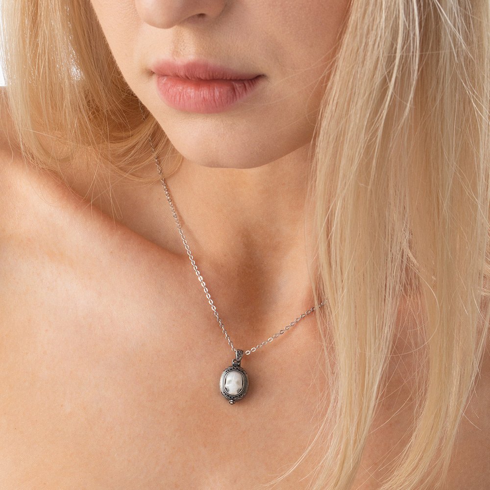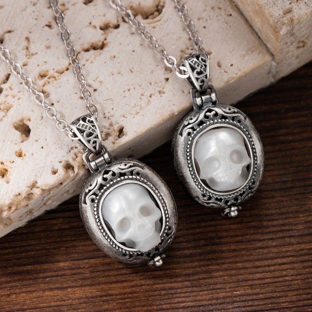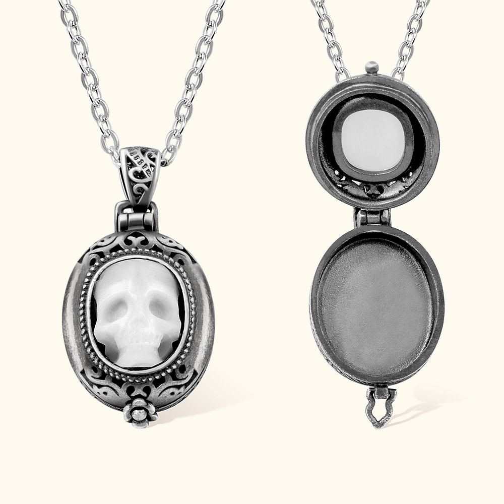 Our necklace is integrated with a small box design, added to the locket. The pensioned piece of the necklace is partially adopted by the exquisite pearl craft carving process and presents a delicate skull image. The edge of the pendant is decorated with complex patterns, which increases the overall layer and stereoscopic feeling, making the necklace more delicate. The back of the necklace can also customize the text to make it more special.