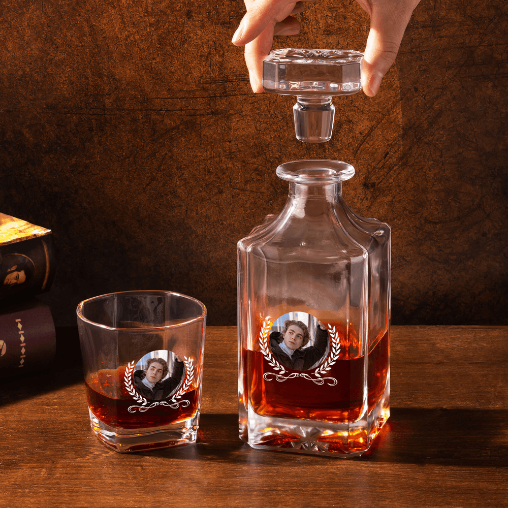 This stunning whiskey decanter allows for customization with photos, creating a personal and distinctive piece for whiskey enthusiasts. Its sophisticated design makes it a standout item in any drinkware collection, perfect for commemorating special moments.
