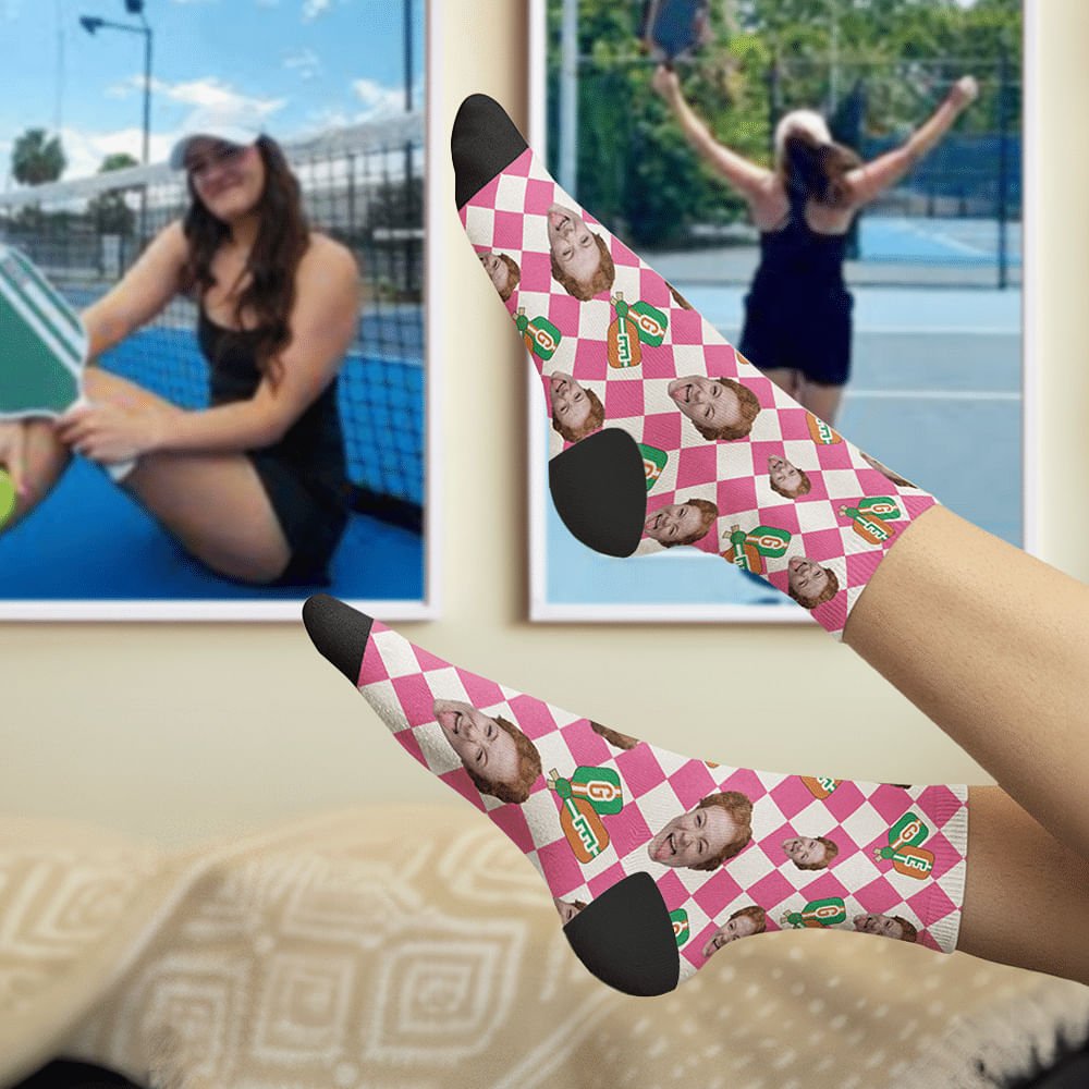 These socks have a chequered pattern and rich colors. Paired with a custom picture of the human face and pickleball paddles, it helps to add to the overall sense of fashion and adds a personalized visual effect to the wearer.