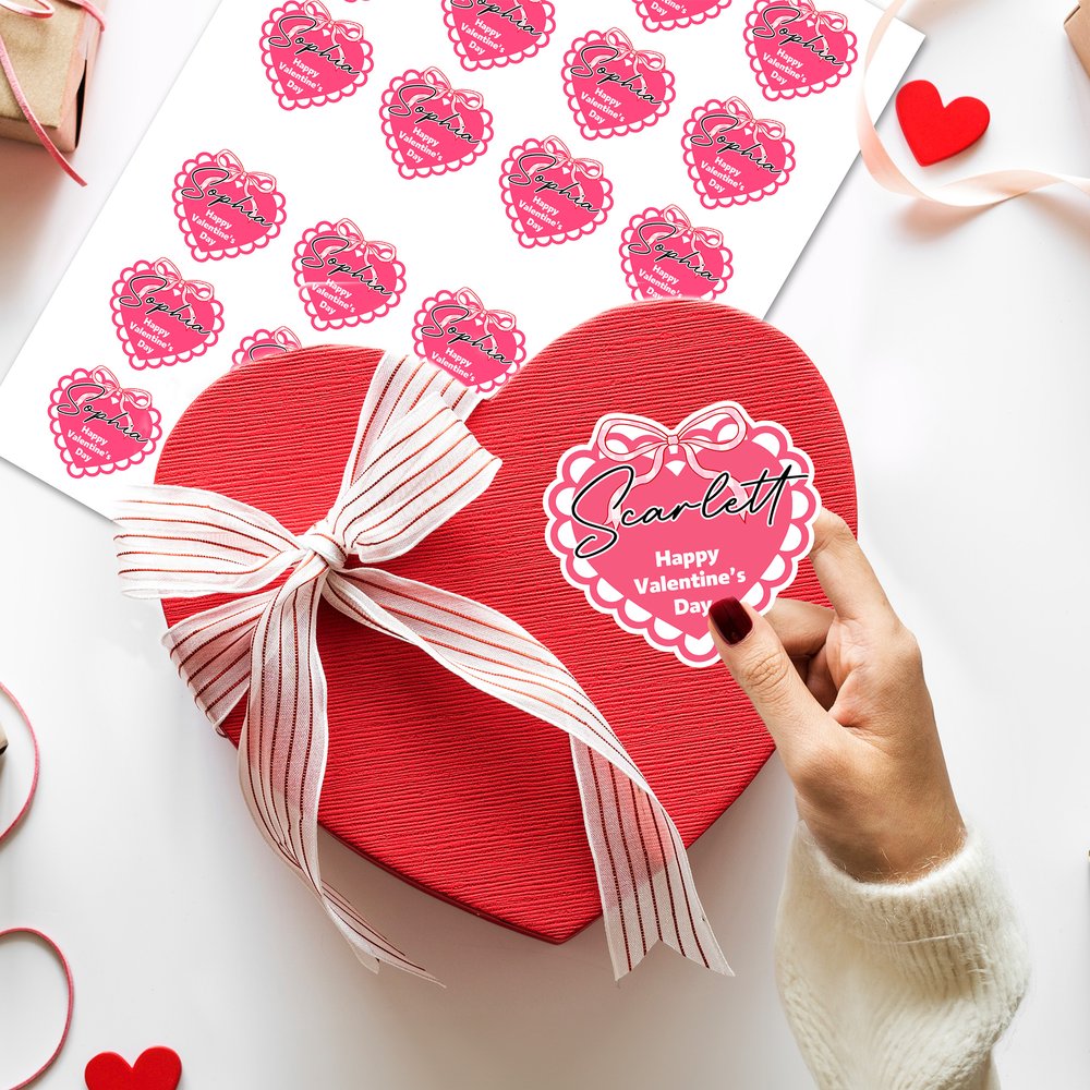Featuring a classic heart shape paired with Valentine's Day-themed text, and customizable with a personalized name, this simple yet sweet design effortlessly embellishes gifts, giving each sentiment a unique romantic touch.