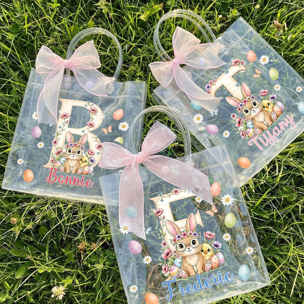 This transparent gift tote bag features a charming pink ribbon bow and playful Easter motifs, including adorable bunnies, chicks, and colorful scattered eggs. You can personalize it with a custom name or initials, creating a special and festive bag tailored just for your little one.