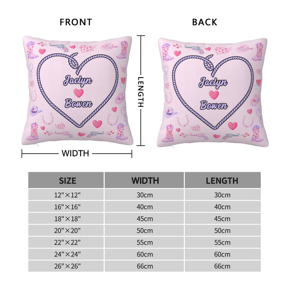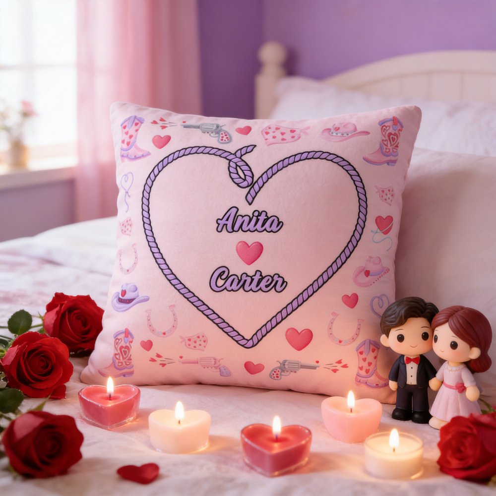 Customize this pillow to celebrate your bond by adding both partners’ names. The design pairs your names with a playful pink cowboy theme (heart-shaped lasso, boots, and hats), turning a basic pillow into a unique, romantic keepsake that feels tailored to your relationship.