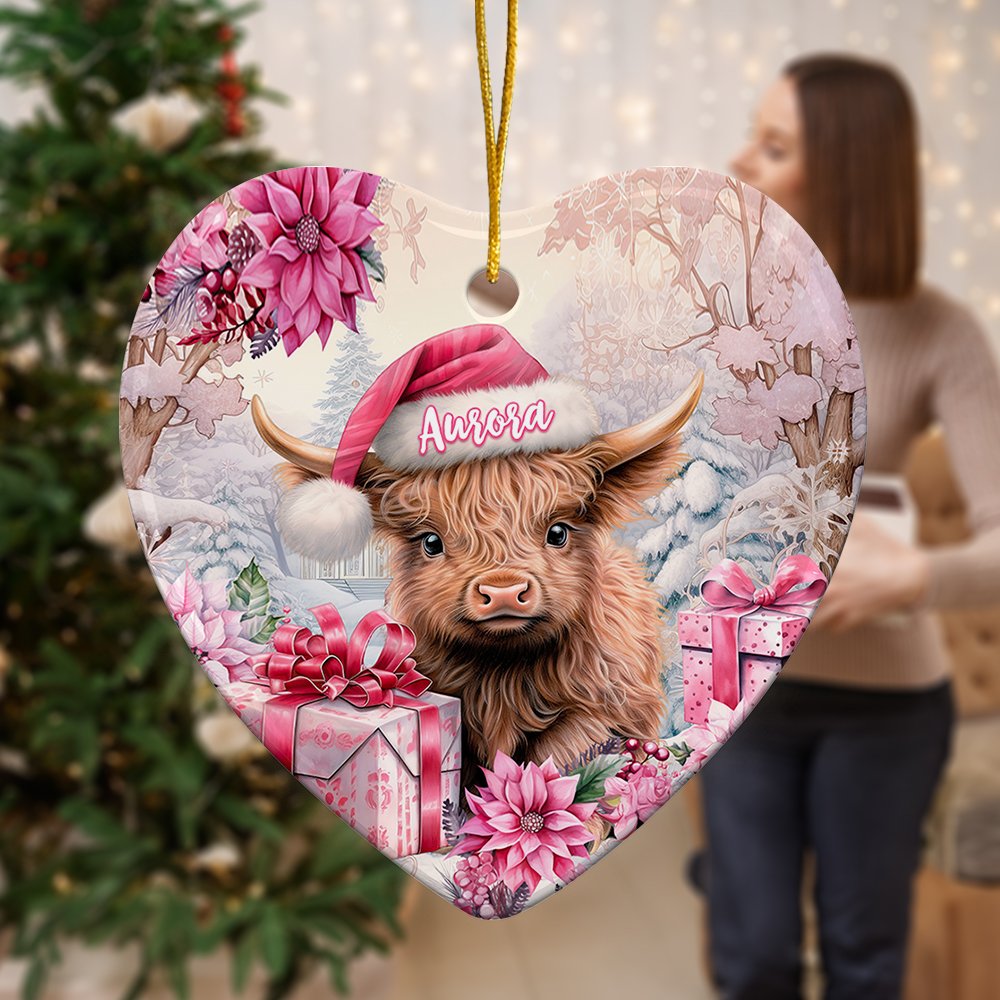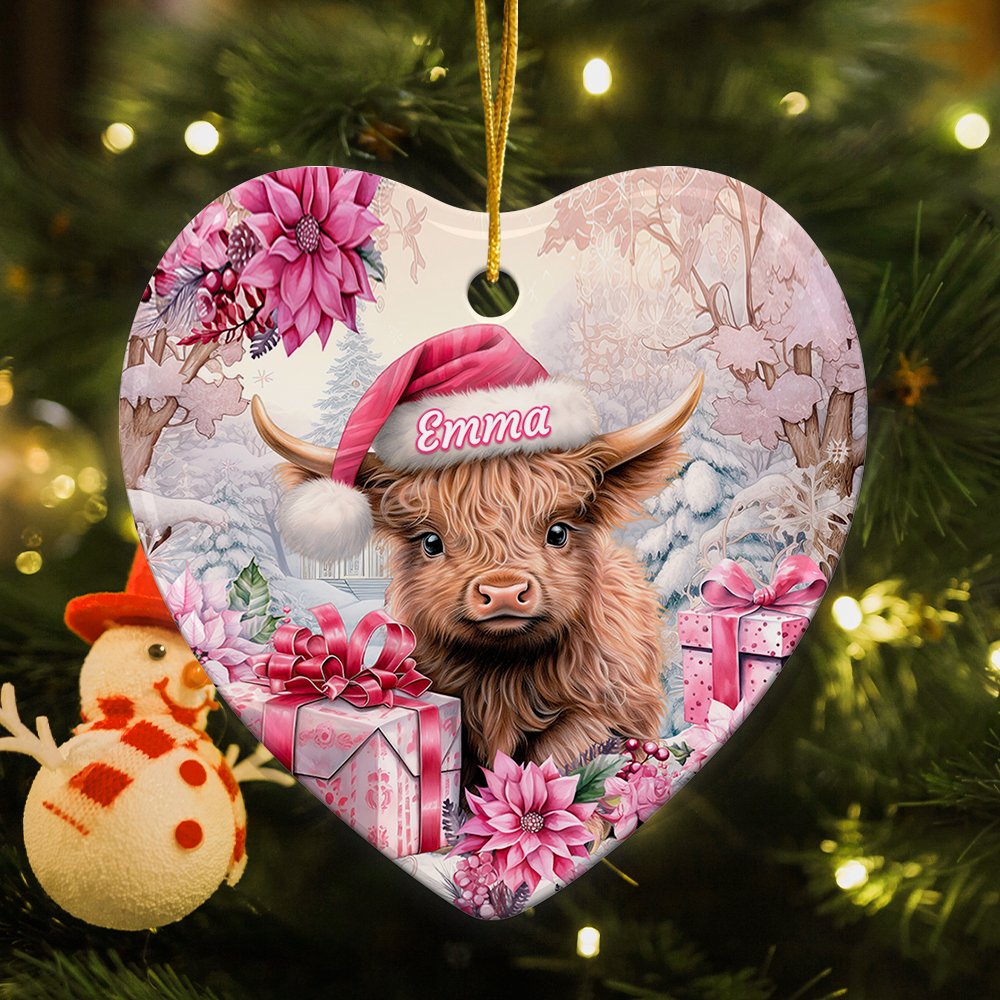 The heart shaped ceramic ornament features a cute and festive pink highland cow design, making it the perfect gift for friends and family during the Christmas season. The option to customize the cow's hat with a name adds a special touch, making this ornament unique to its owner.
