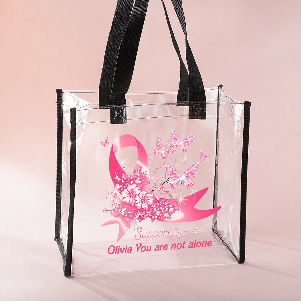 This bag is loved for its stylish design and deep symbolic meaning. Printed on the front of the bag are elegant butterflies and pink ribbons symbolizing breast cancer awareness, as well as beautiful design elements that convey hope and resilience. The words "Support Squad. You are not alone" on the ribbon make the bag full of love and support. The bag can also be customized with a name to convey support and encouragement to the patient, making it a gift filled with love and care.