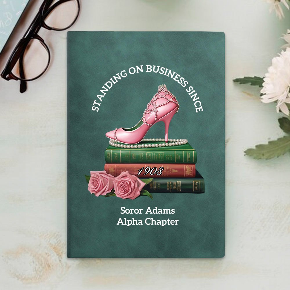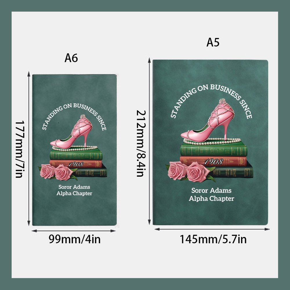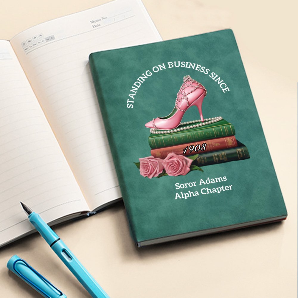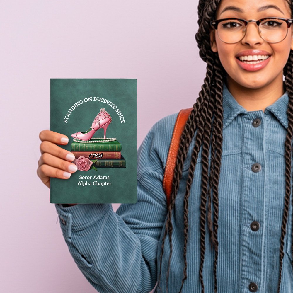 Keep track of your sorority with our notebooks. Featuring a classic green matte cover design with pink roses and high heels, and the fixed text "STANDING ON BUSINESS SINCE" and "1908", the overall elegant appearance. You can also add custom text, this design makes the notebook more memorable and shows your connection to your sorority, perfectly representing your school experience and sisterhood.
